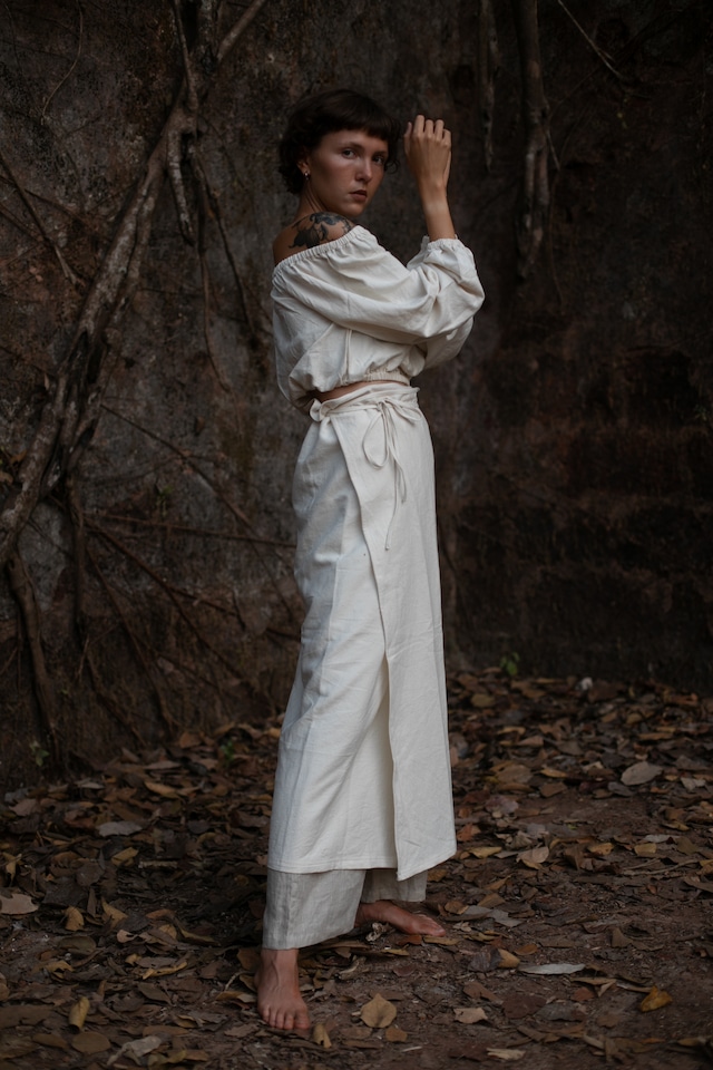 インドの伝統的な手織り布 「ハンドルームコットン」で仕立てた、生成りのトップスです。 電力を使わず、職人の手仕事でゆっくりと織られるため、一つひとつにやさしい表情が残ります。 触れた瞬間に感じる、オーガニックコットンならではのやさしい肌触り。手織り特有のスムースで自然な質感が魅力です。 ウエスト位置にある背中の紐をきゅっと絞るとさりげないアクセントに。 装いに静かな個性を添えます。 ─────────────────── Handloomについて 手織り生地は一枚ずつゆっくりと織られるため大量生産ができず、限られた数量のみで作られます。 手仕事ならではの時間と背景を大切にしながら、丁寧に仕立てています。 –––––––––––––––––––––––––––––– Material:Organic Cotton 100% Texture:Handloom (Handwoven) Made in:India / small batch ※手仕事のため、織りムラ・節・ネップなどが見られる場合があります。 –––––––––––––––––––––––––––––– Free Size 着丈:約59cm 肩幅:約42cm 身幅:約101cm ウエスト:約87cm 裾幅:約122cm ──────────── Size Notes ・全て平置き採寸・実寸で表記しています。 ・ハンドメイドのため ±1〜3cm 程度の個体差があります。 ・天然素材のため、洗濯後にわずかな縮みが出ることがあります。 Model / 170㎝
