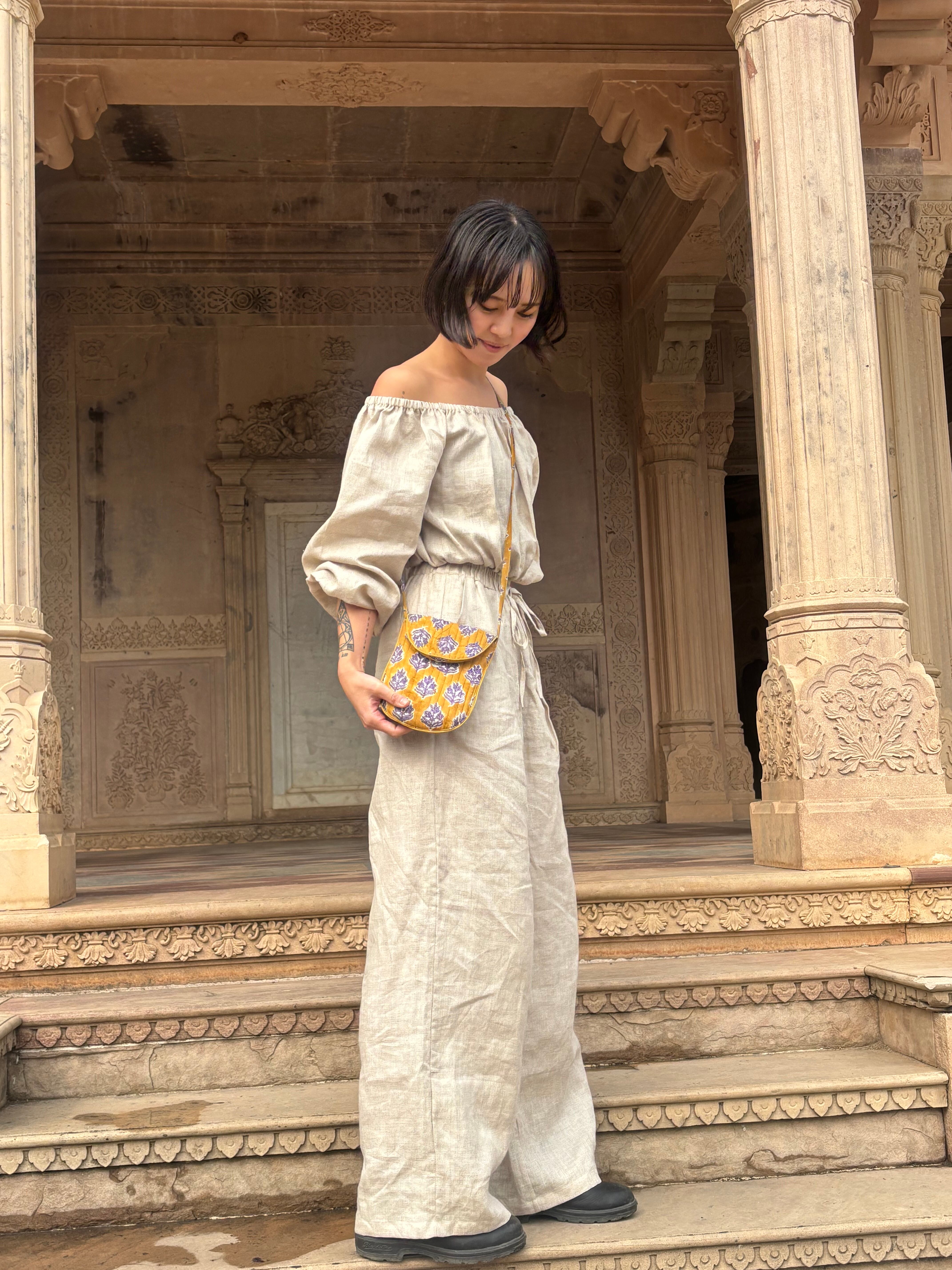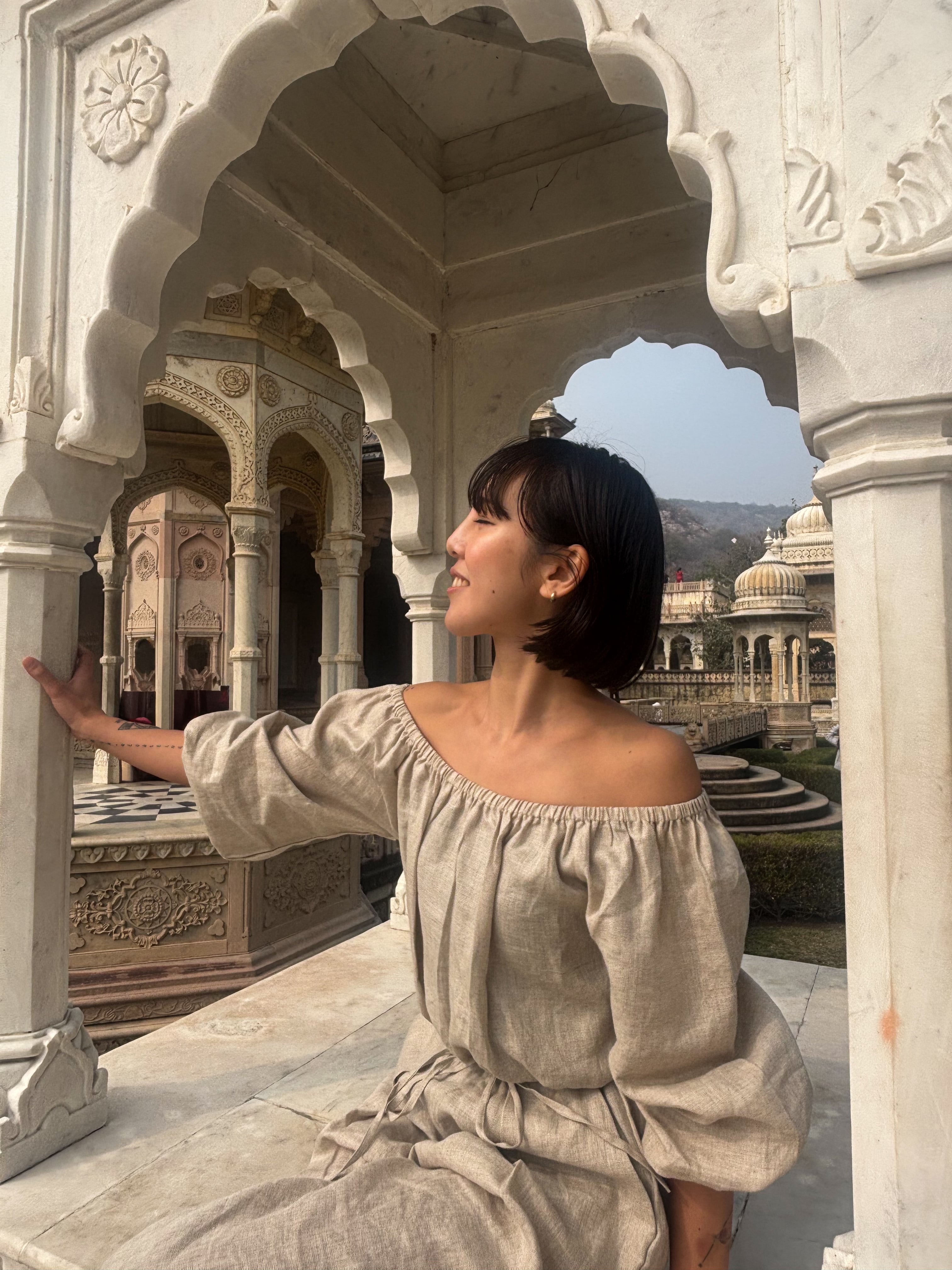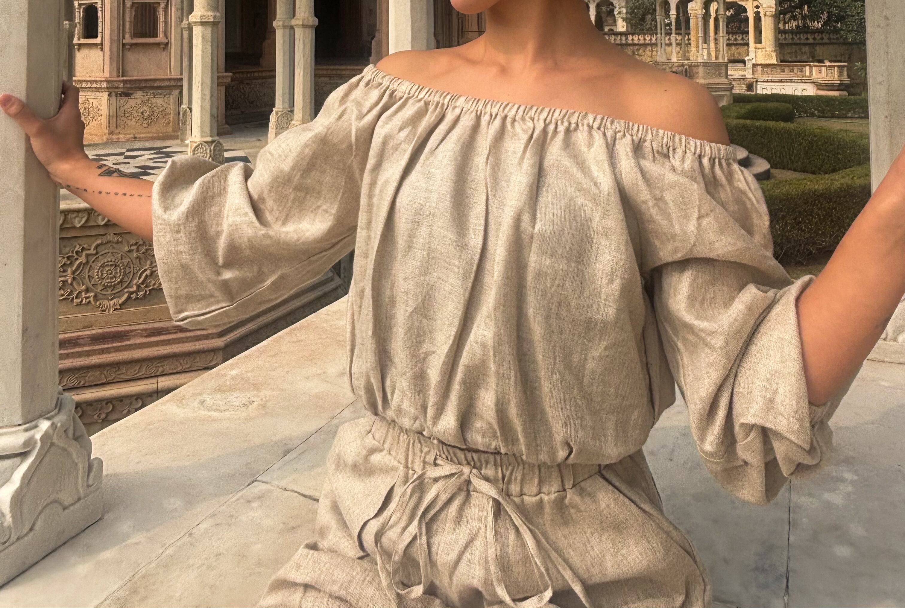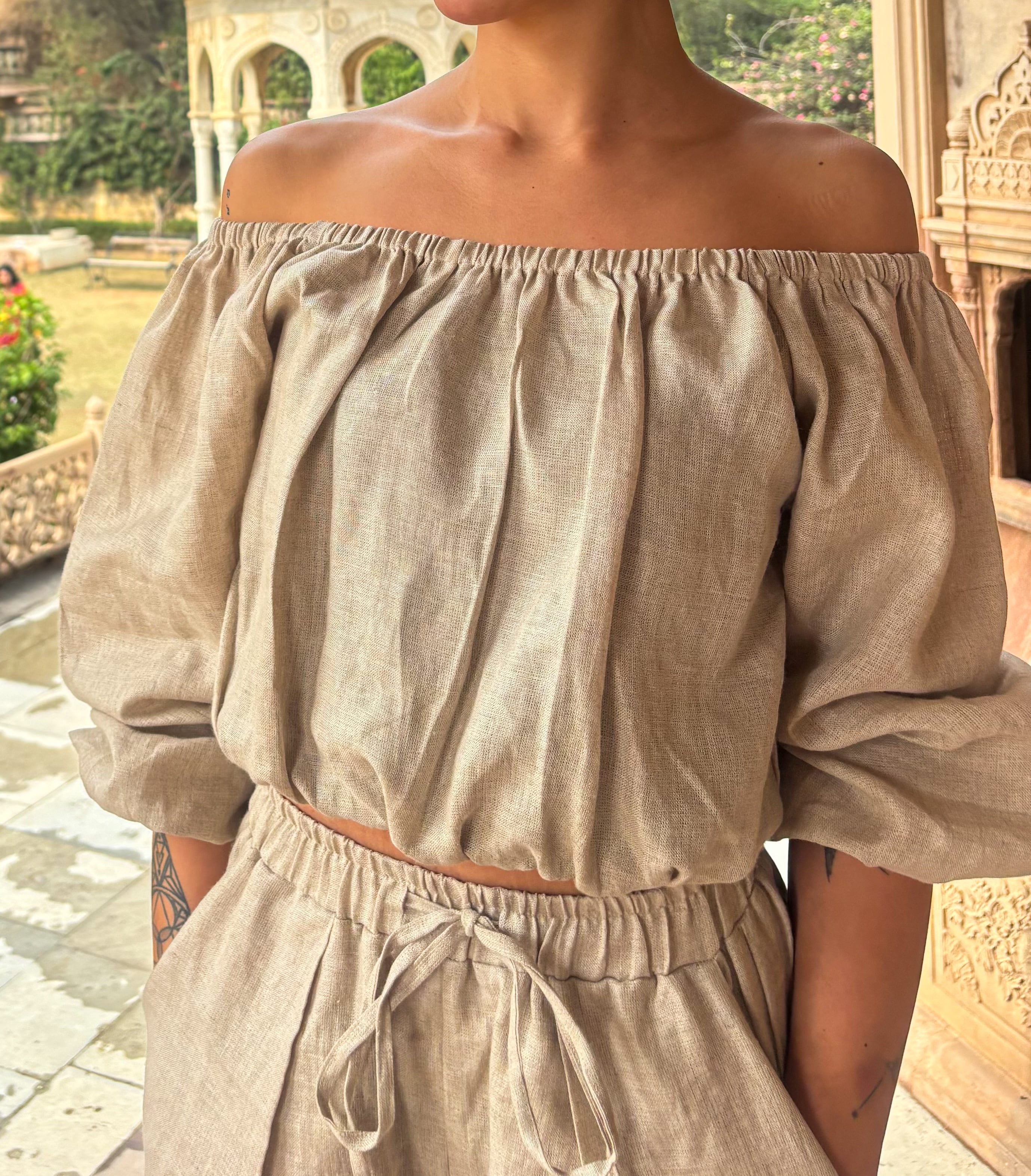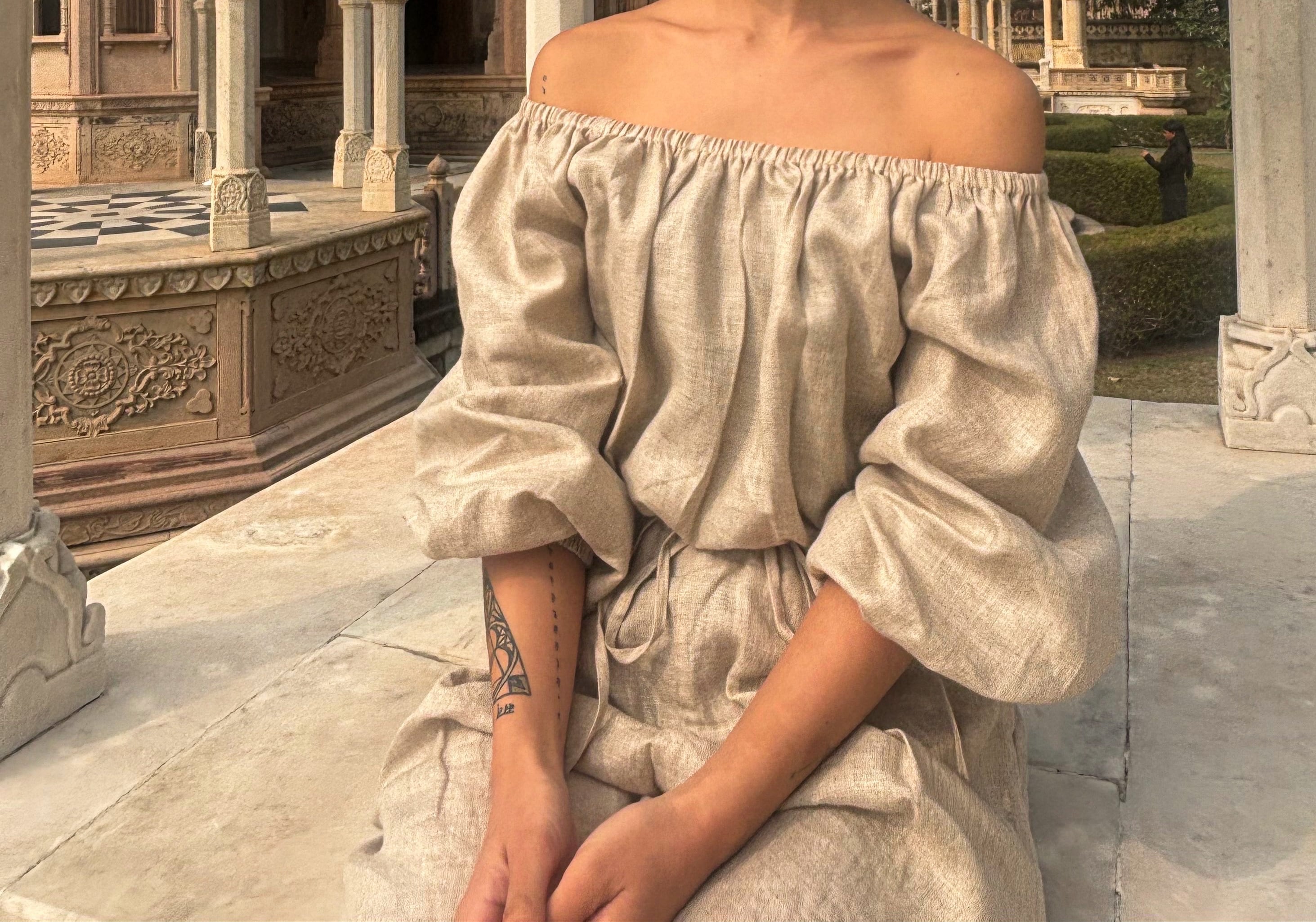 インドで出会った先染め糸のリネンで仕立てた、オフショルダートップスです。