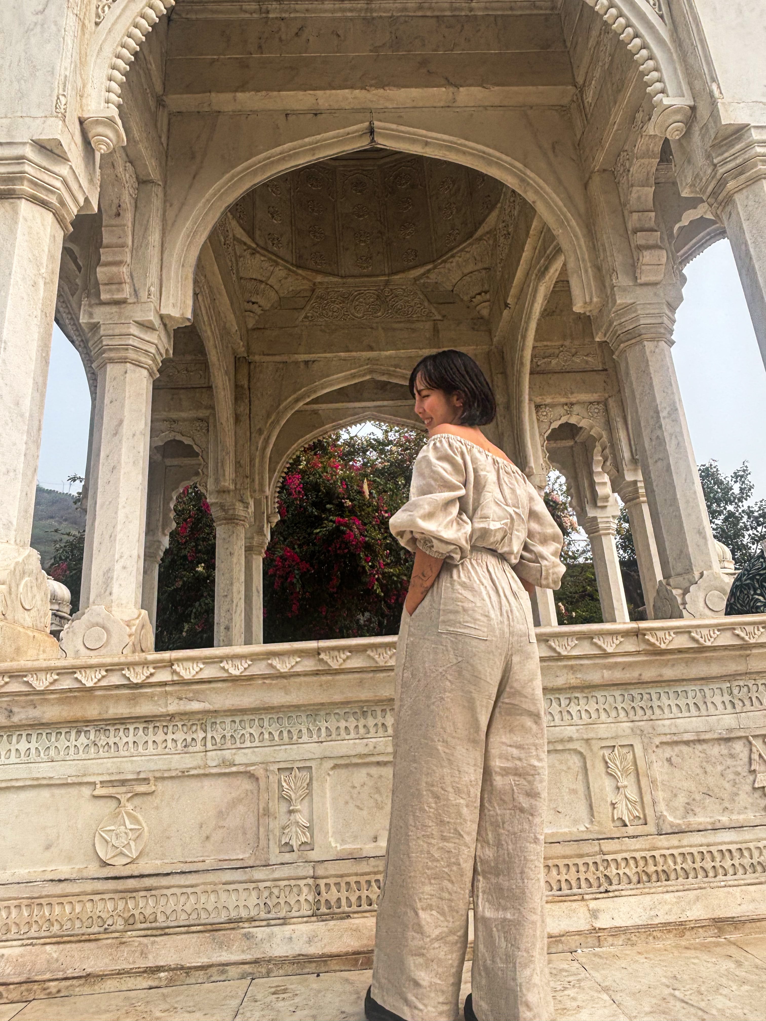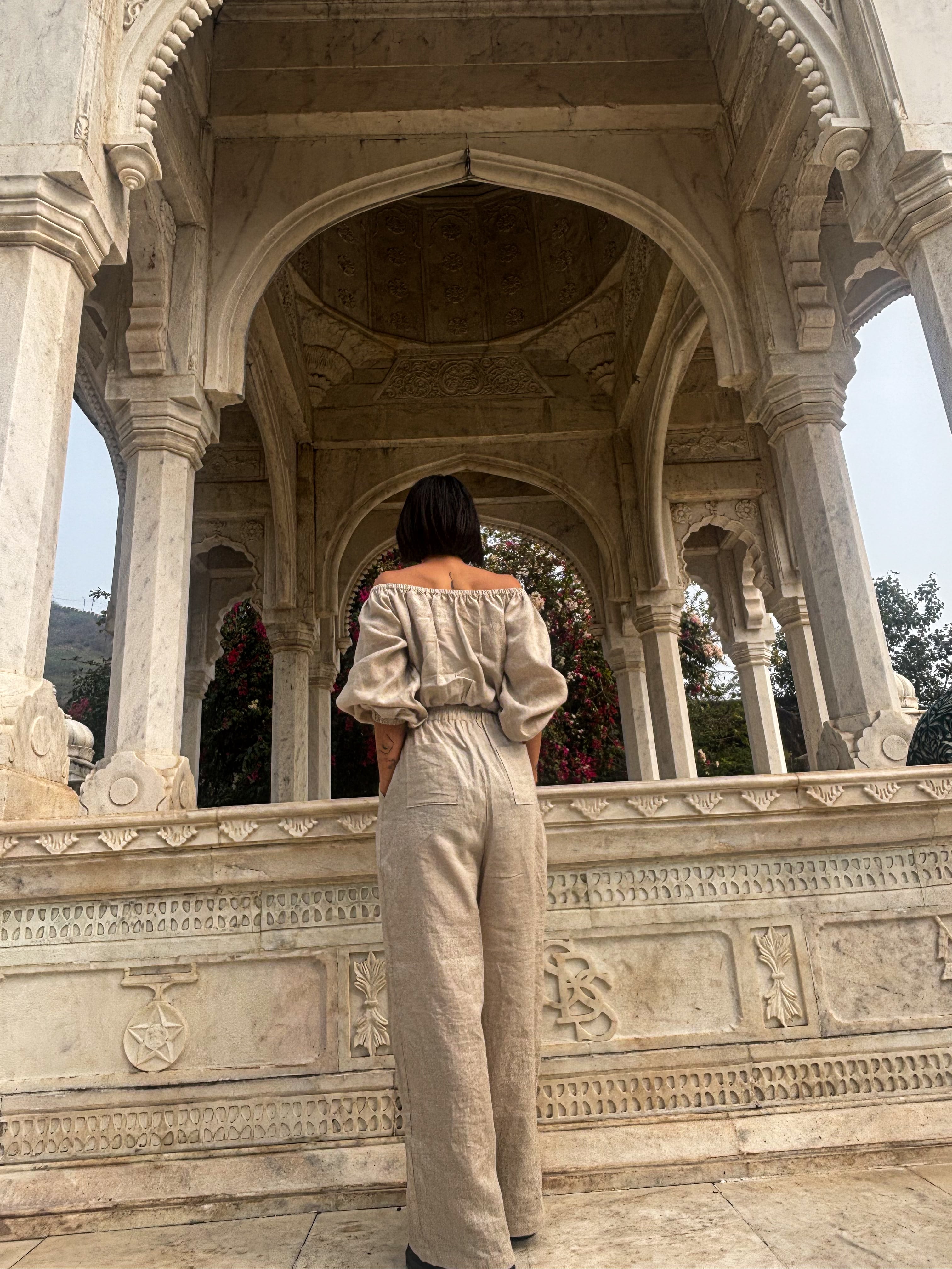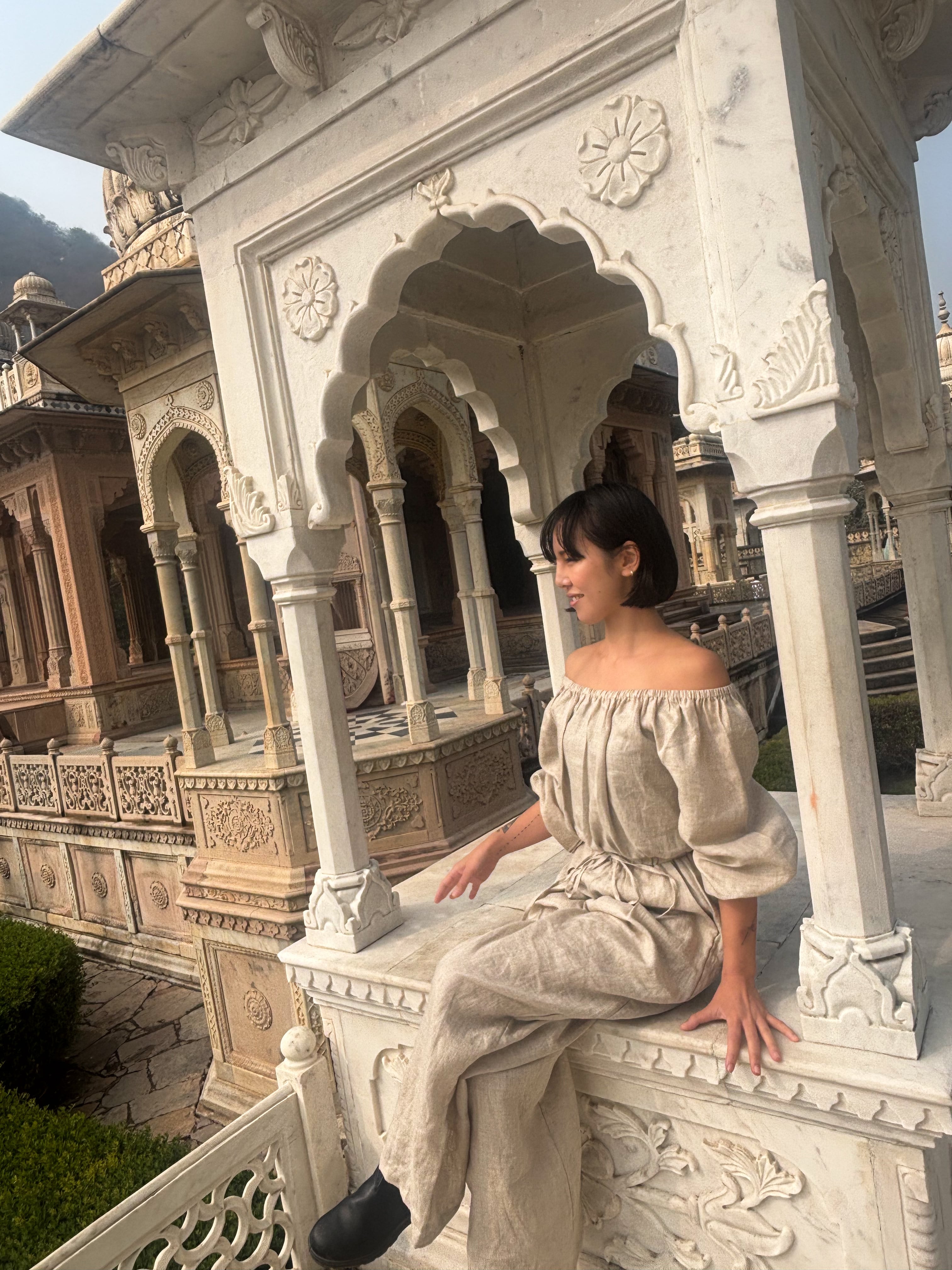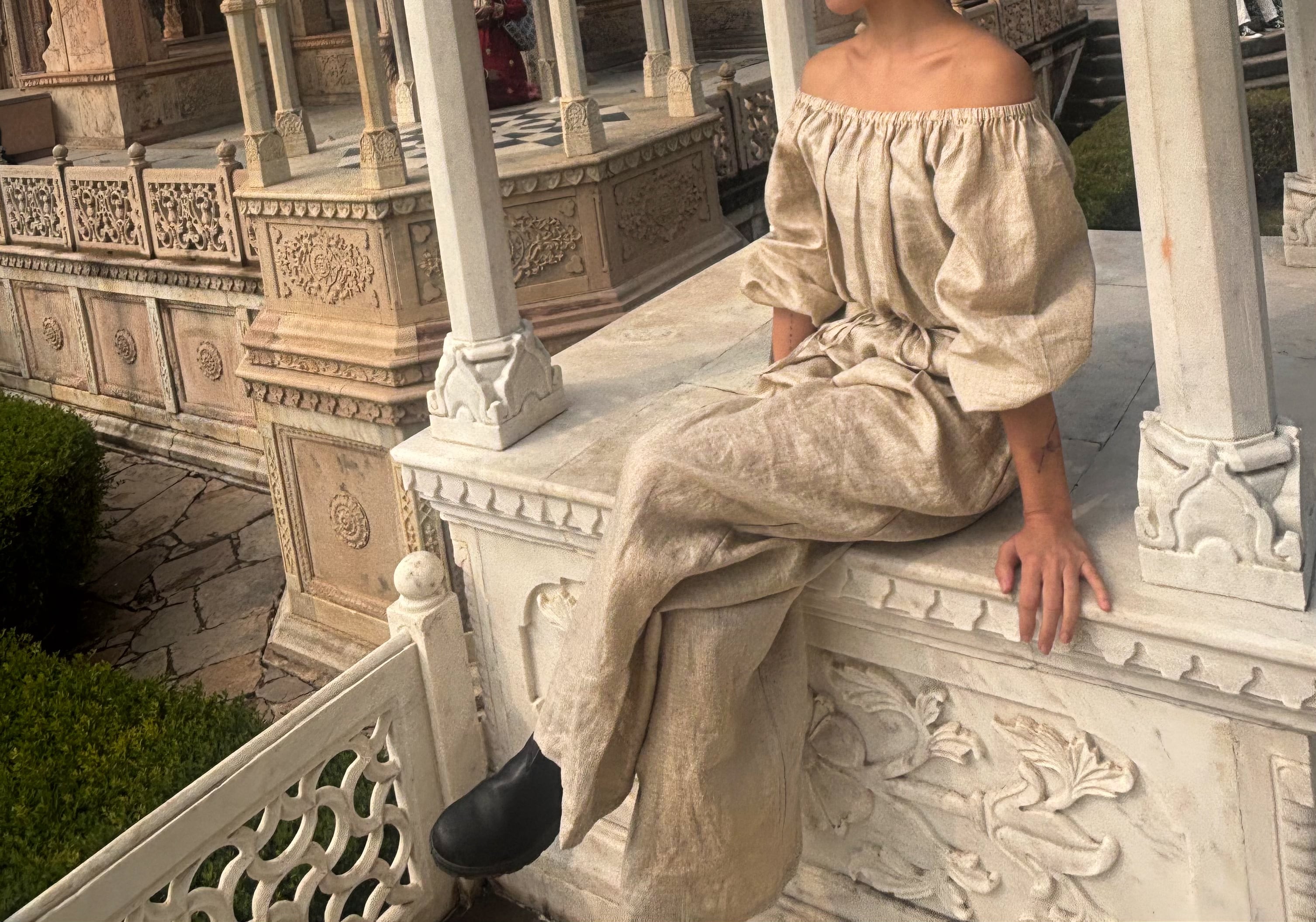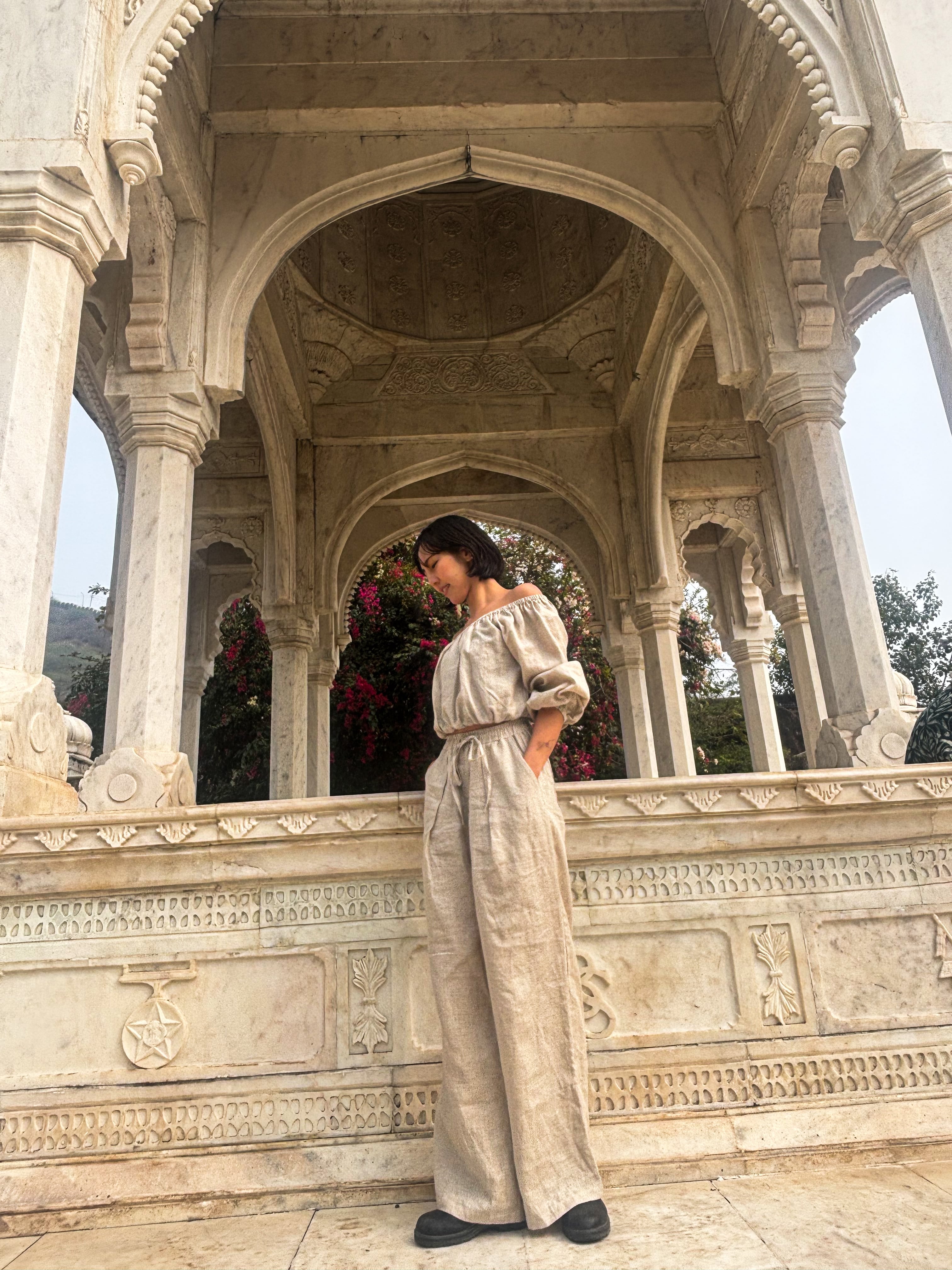 インドで出会った先染め糸のリネンで仕立てた、オフショルダートップスです。