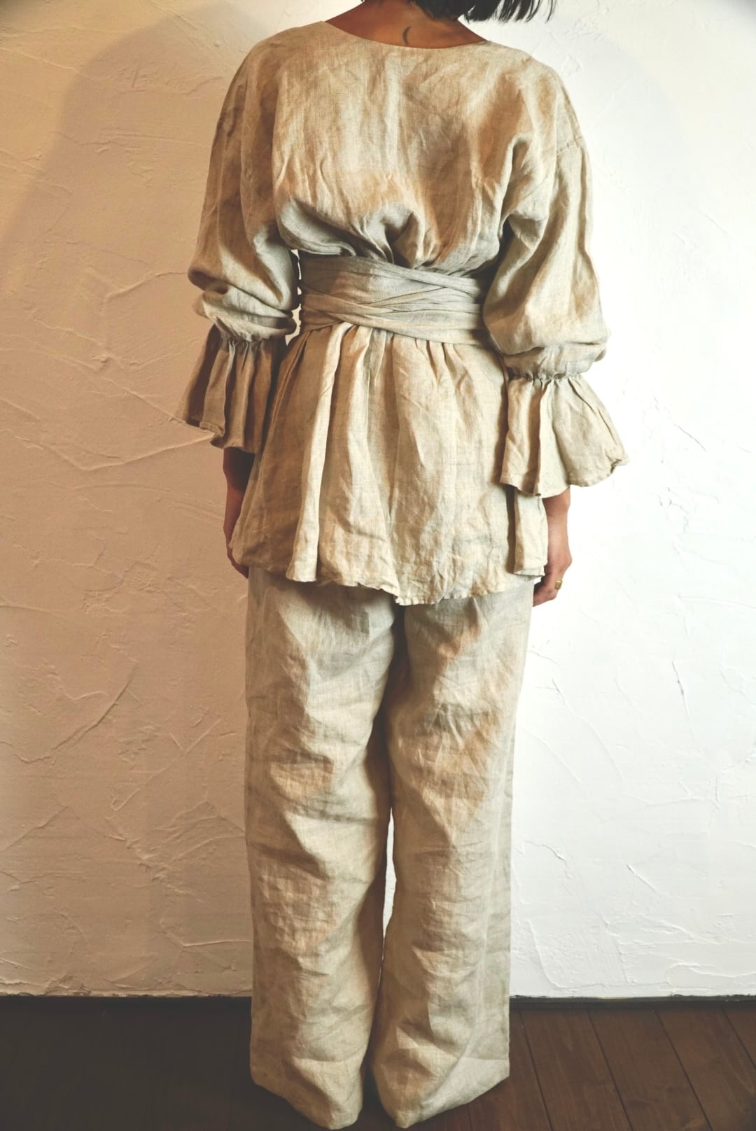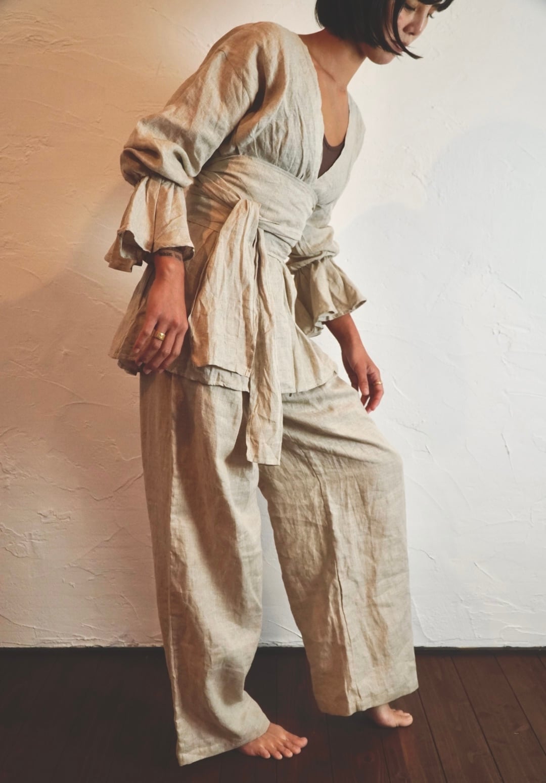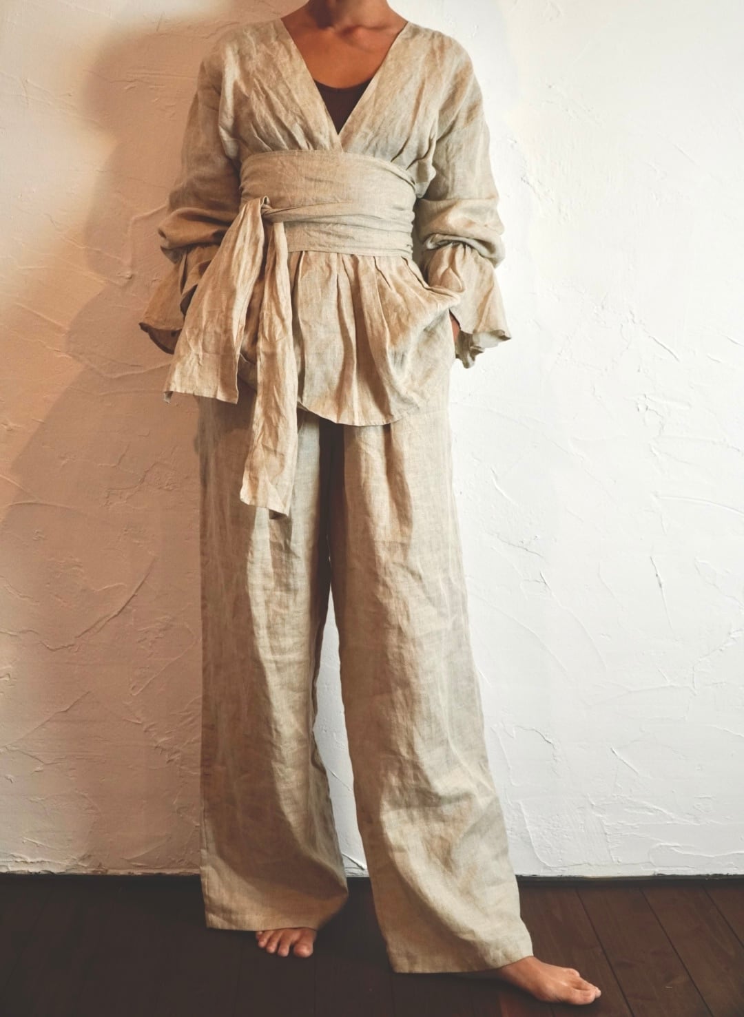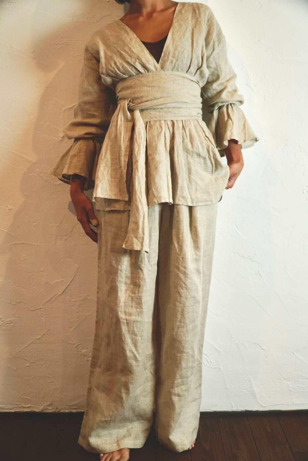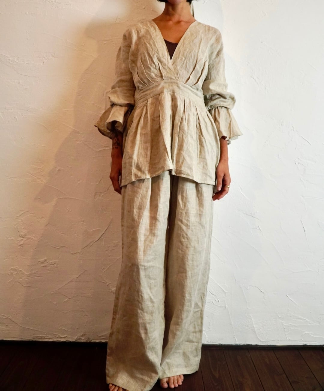 同じ生地のリネンパンツと合わせると、セットアップのように着られて雰囲気がぐっと深まります。
