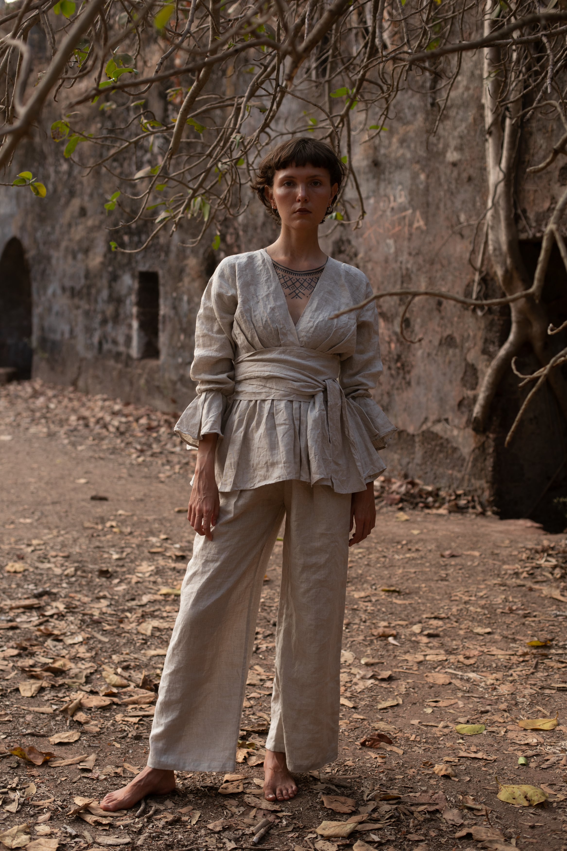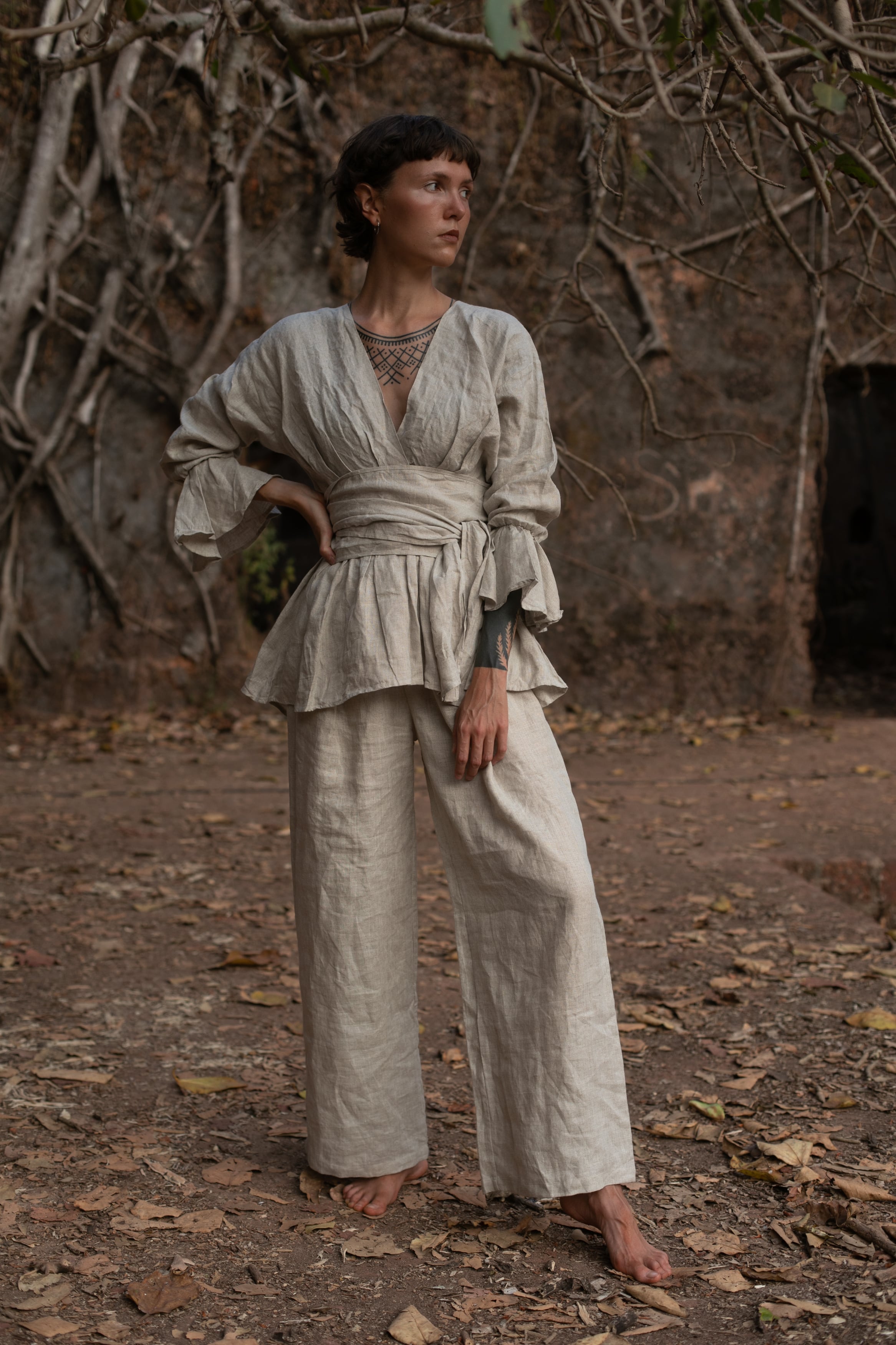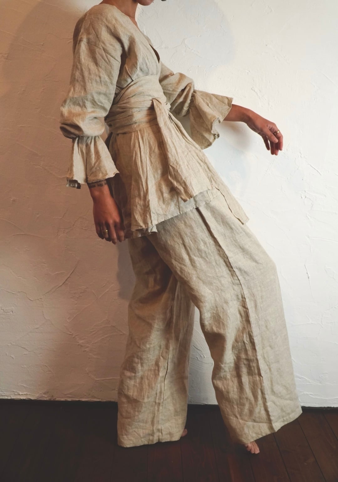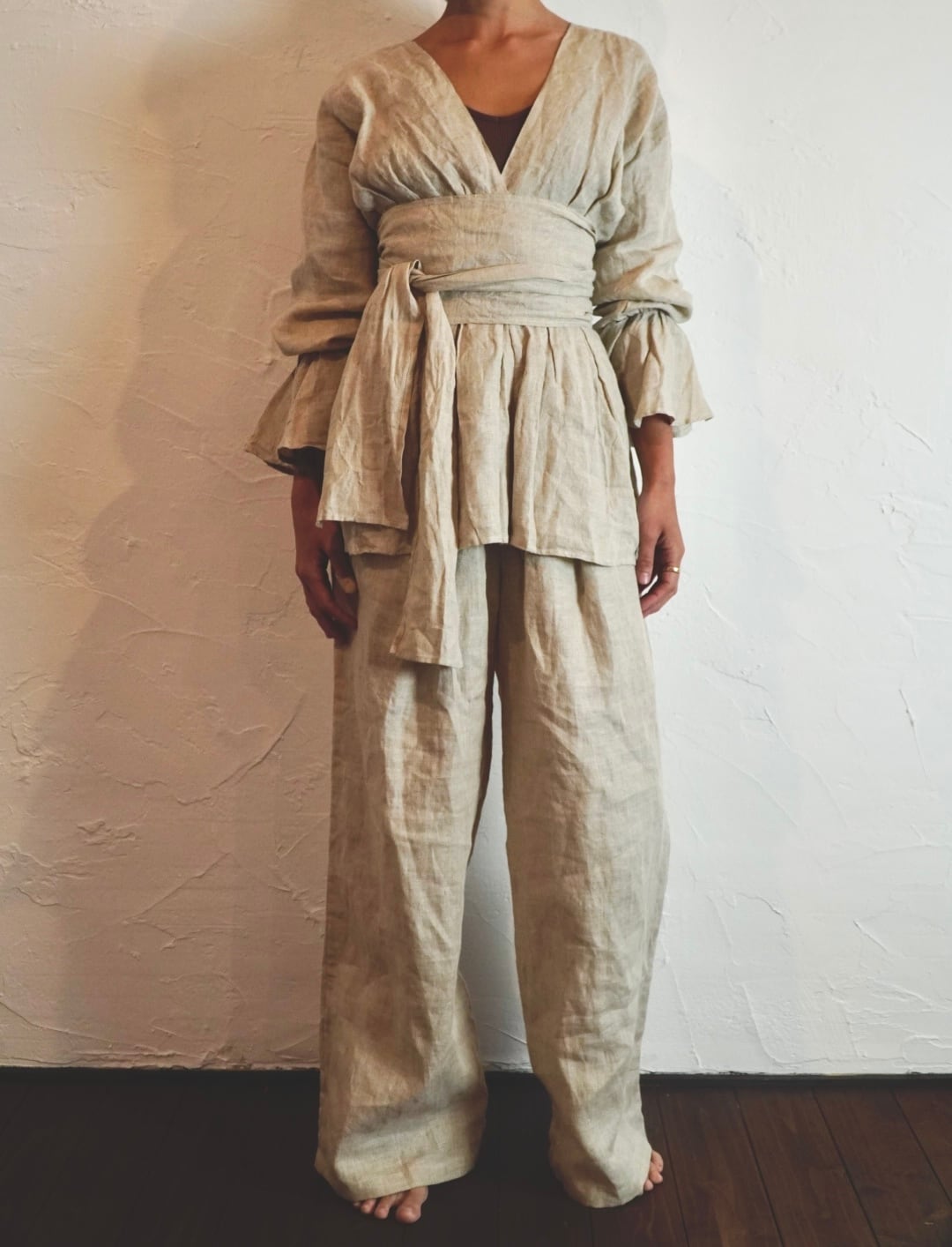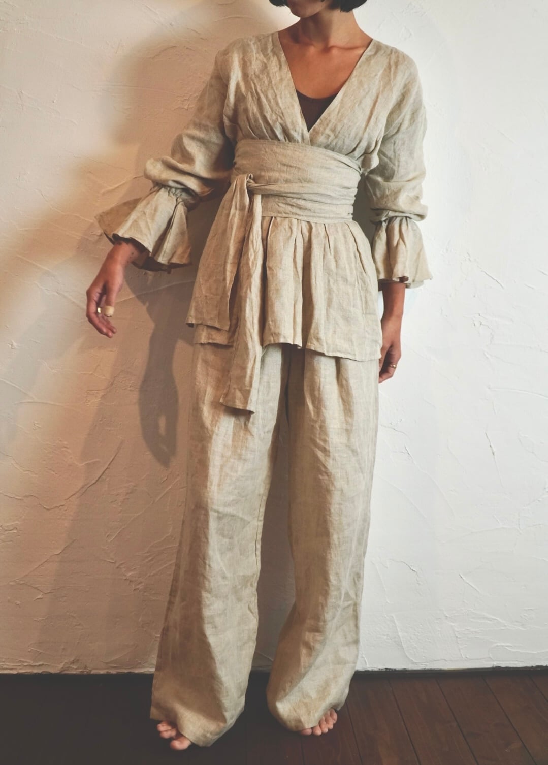 同じ生地のリネンパンツと合わせると、セットアップのように着られて雰囲気がぐっと深まります。