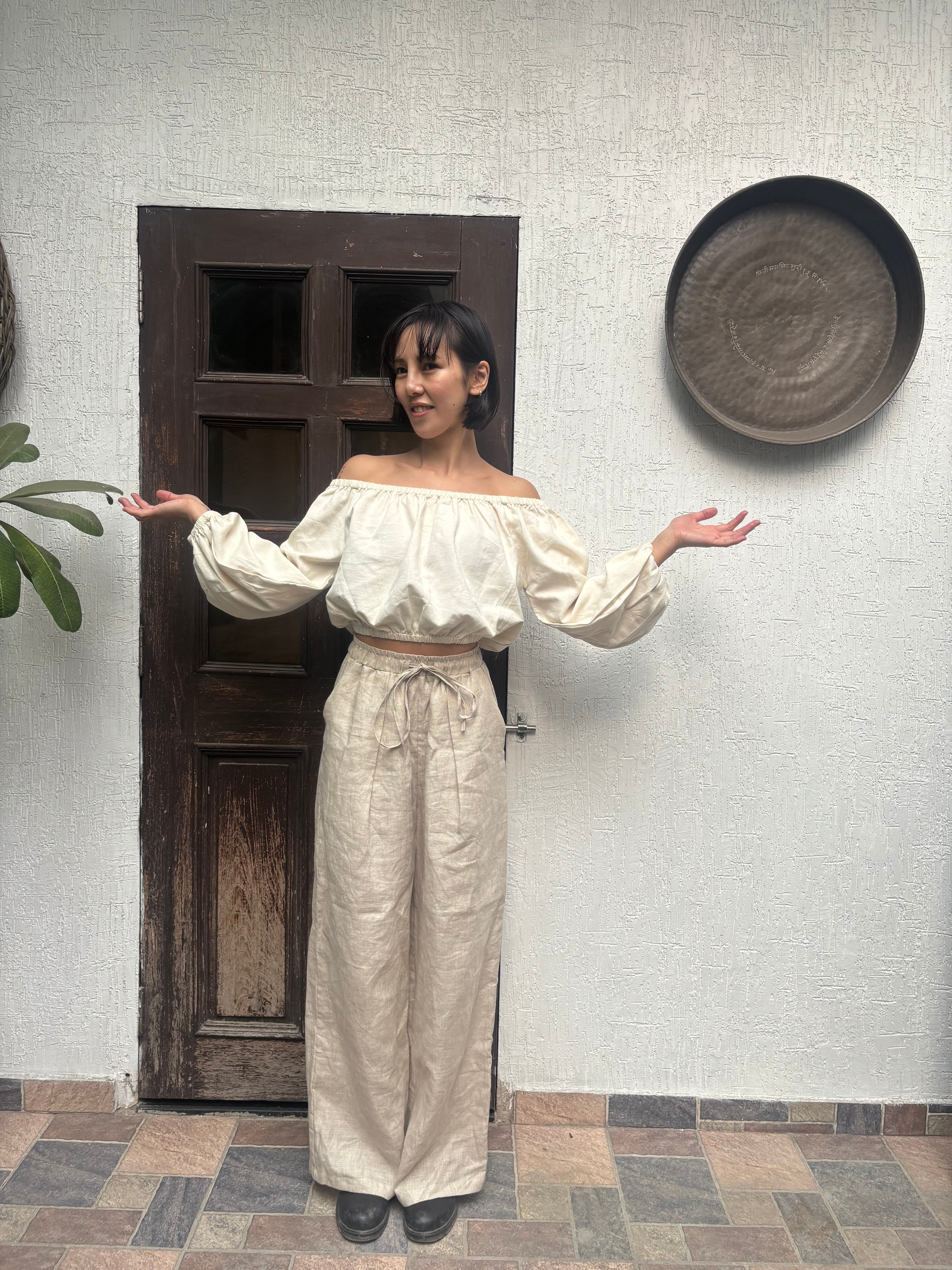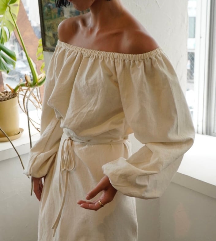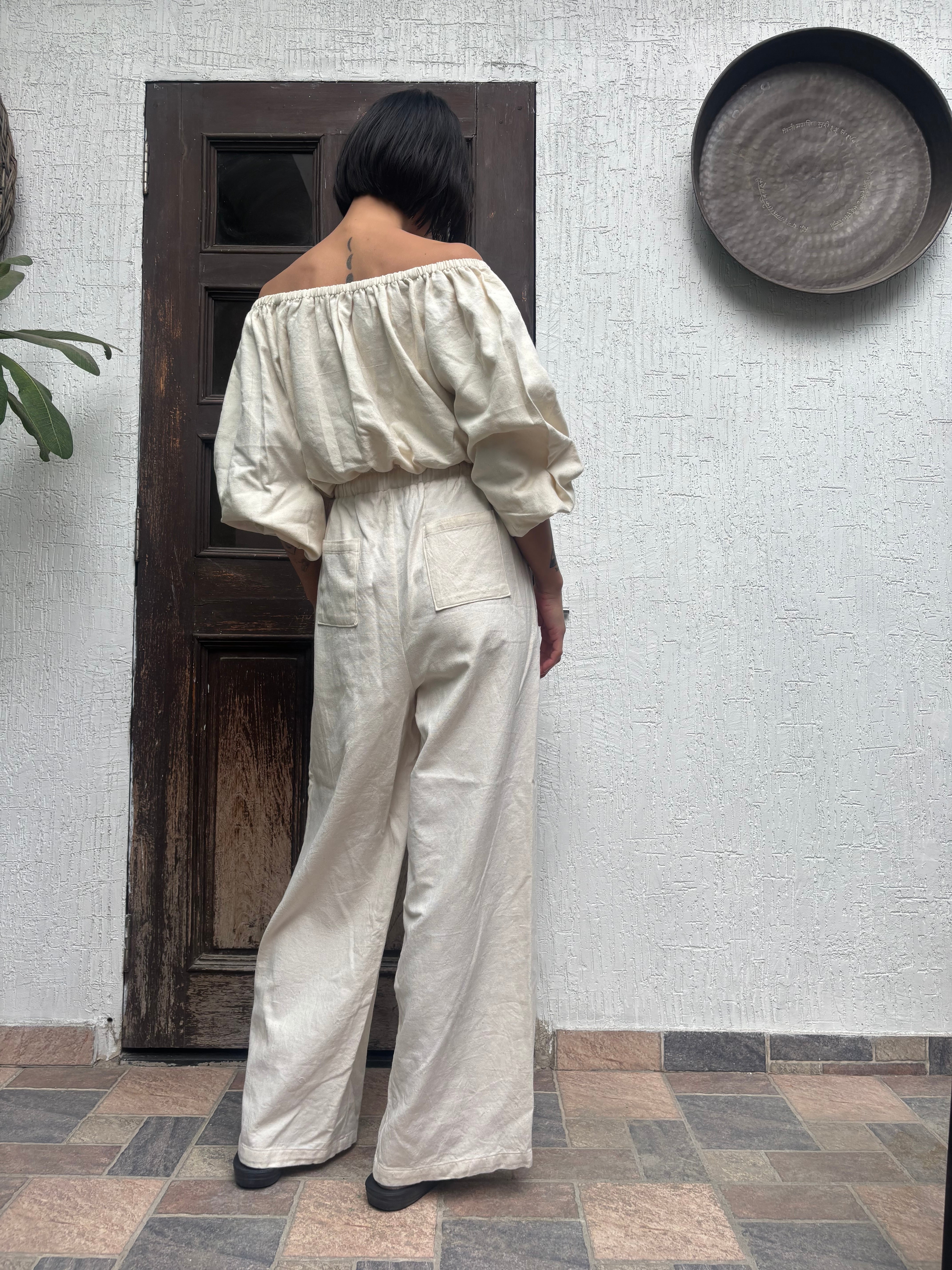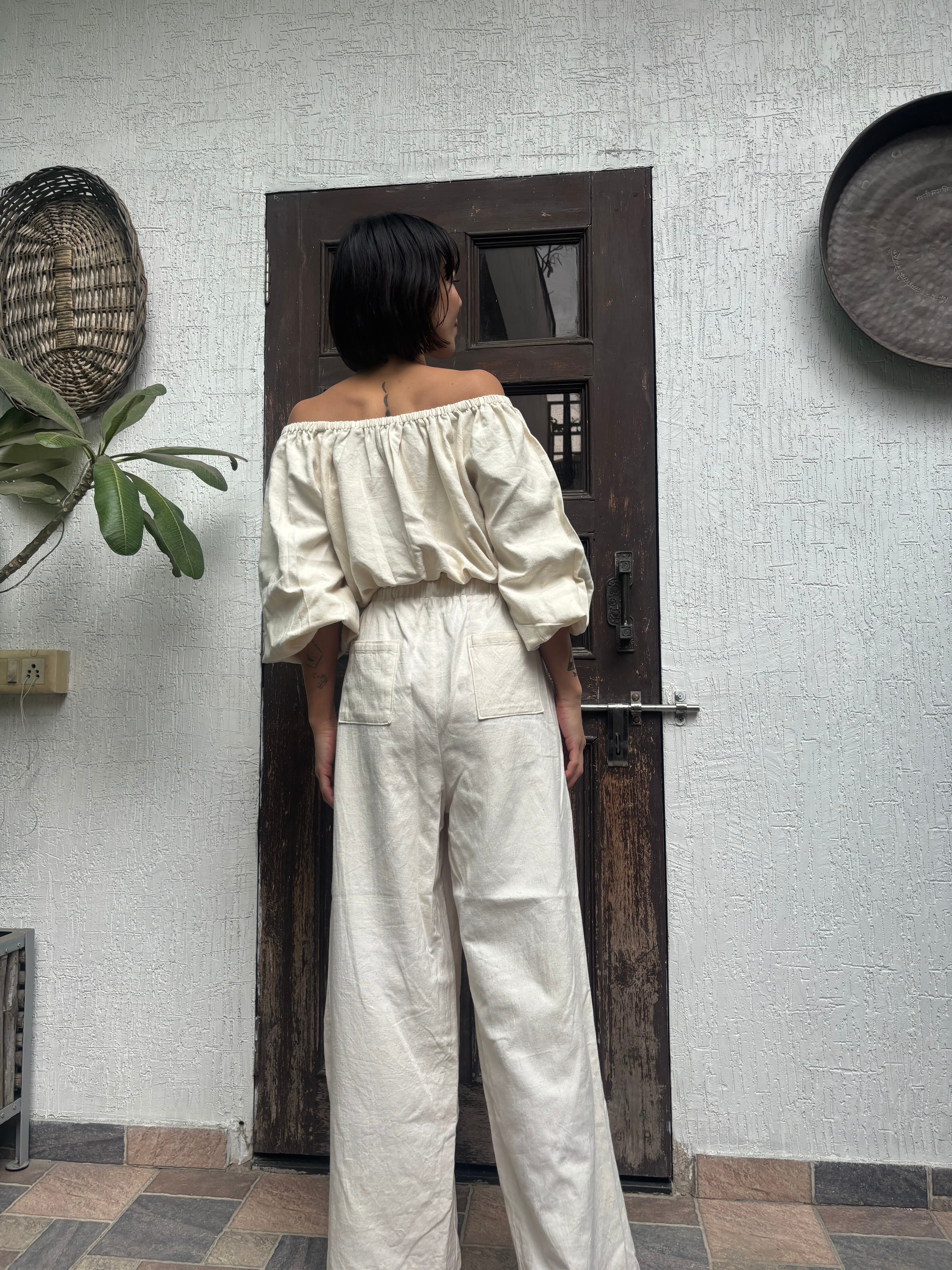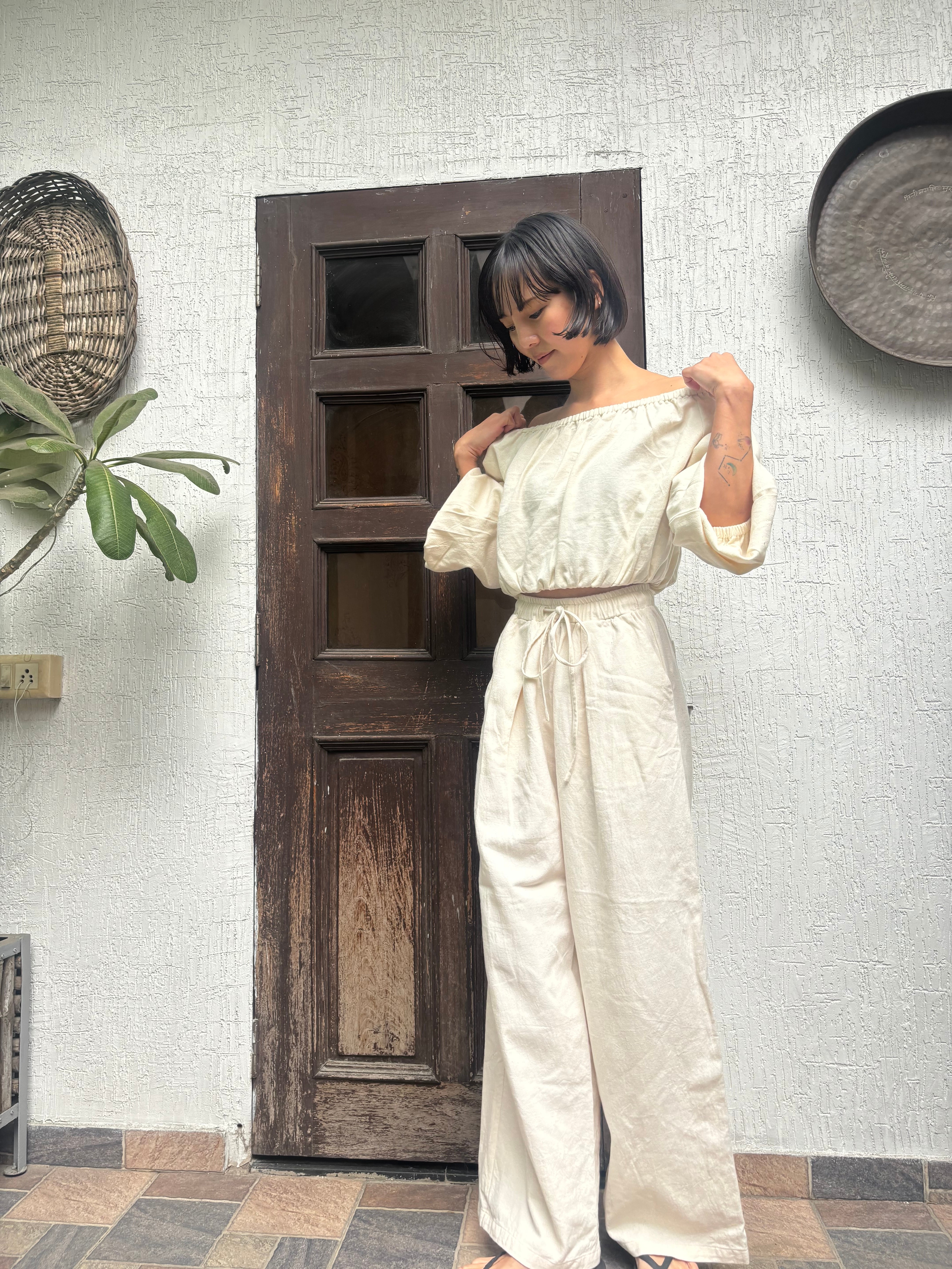 「ハンドルームコットン」で仕立てた、生成りのオフショルダートップスです。
