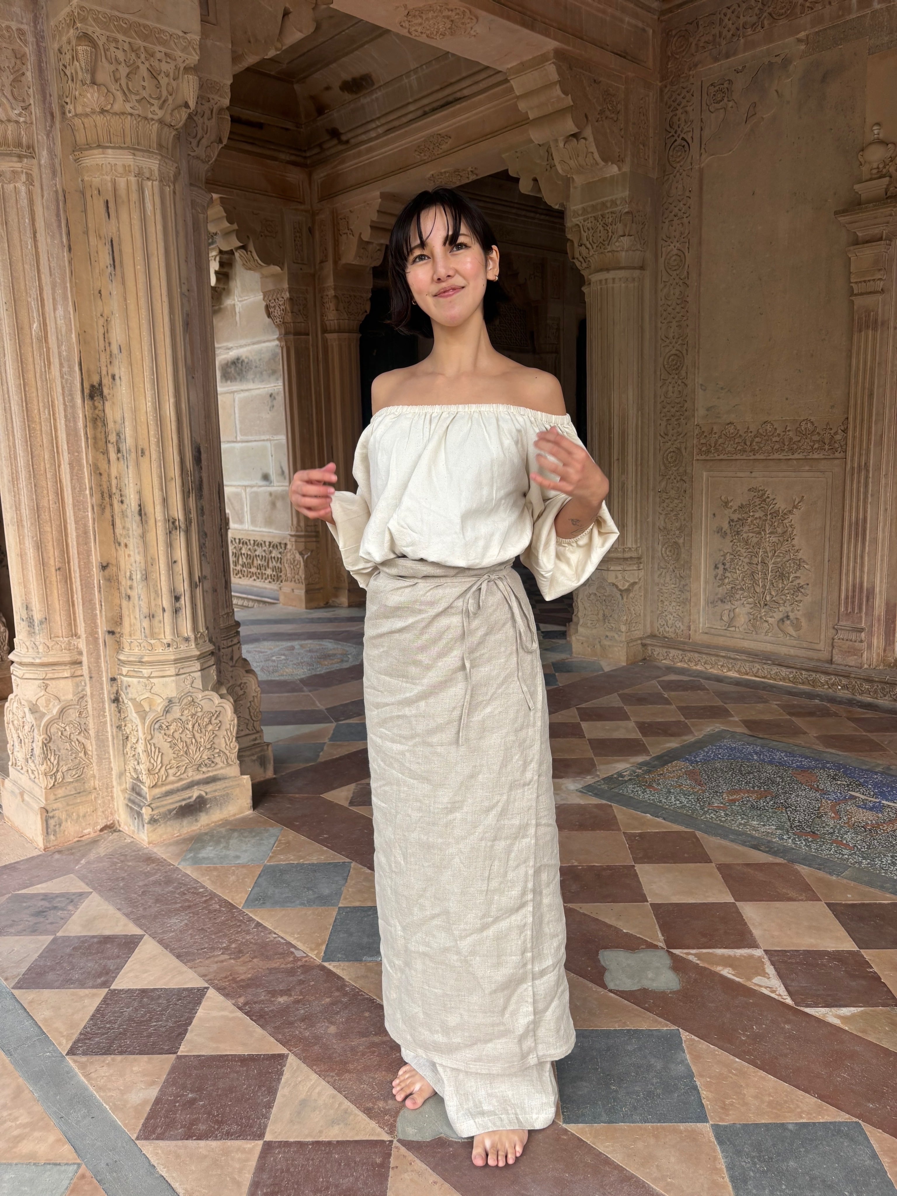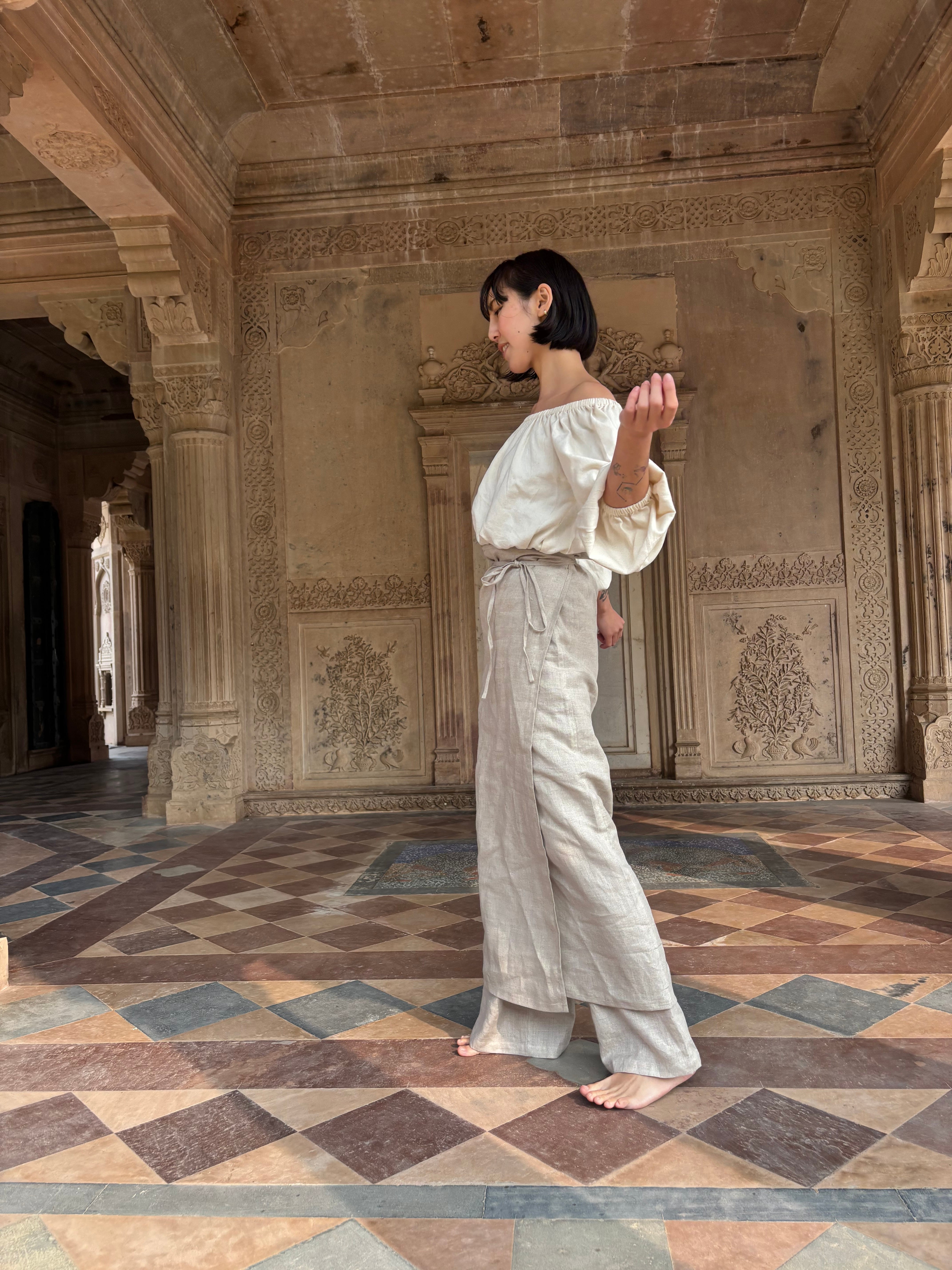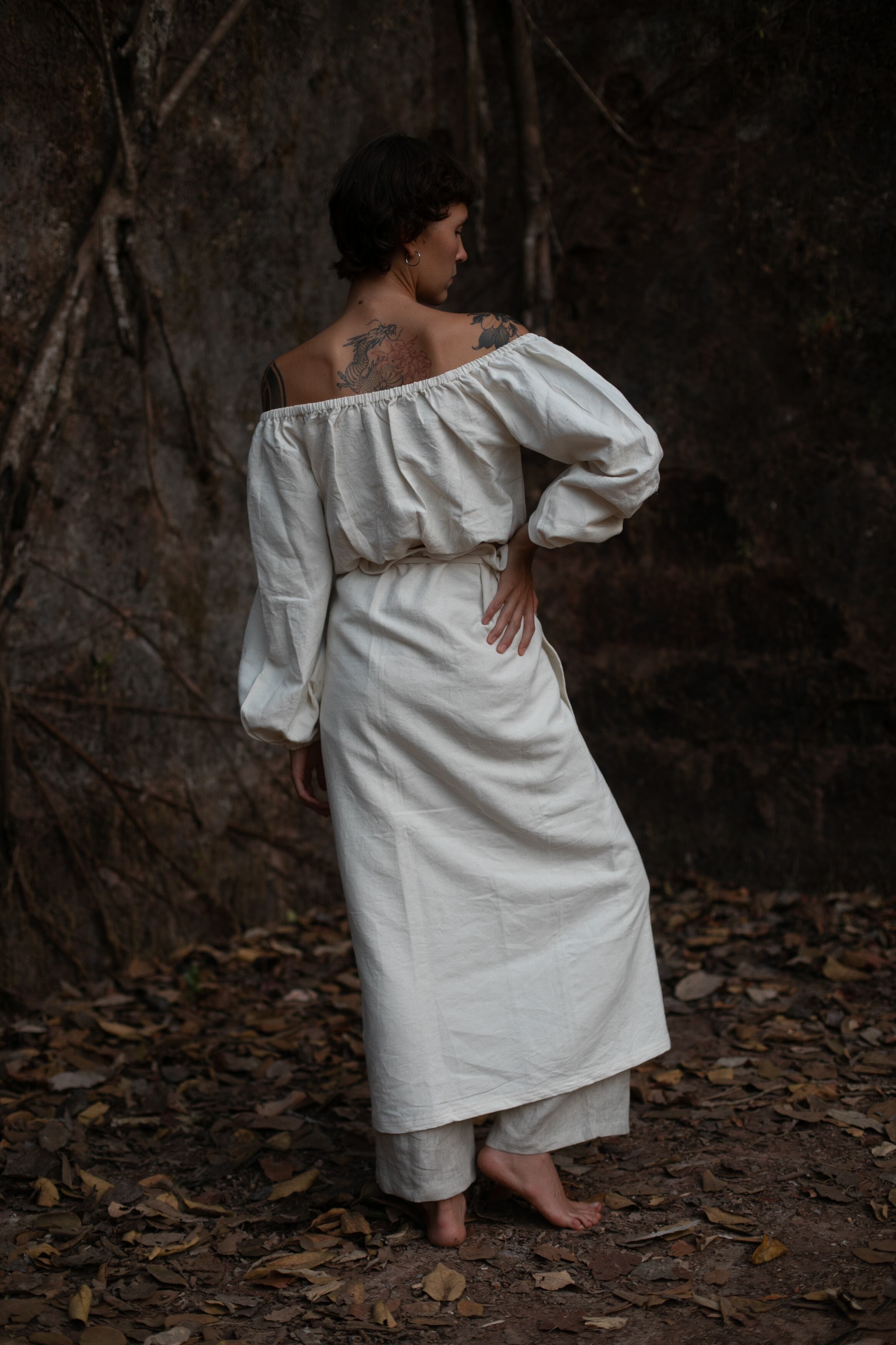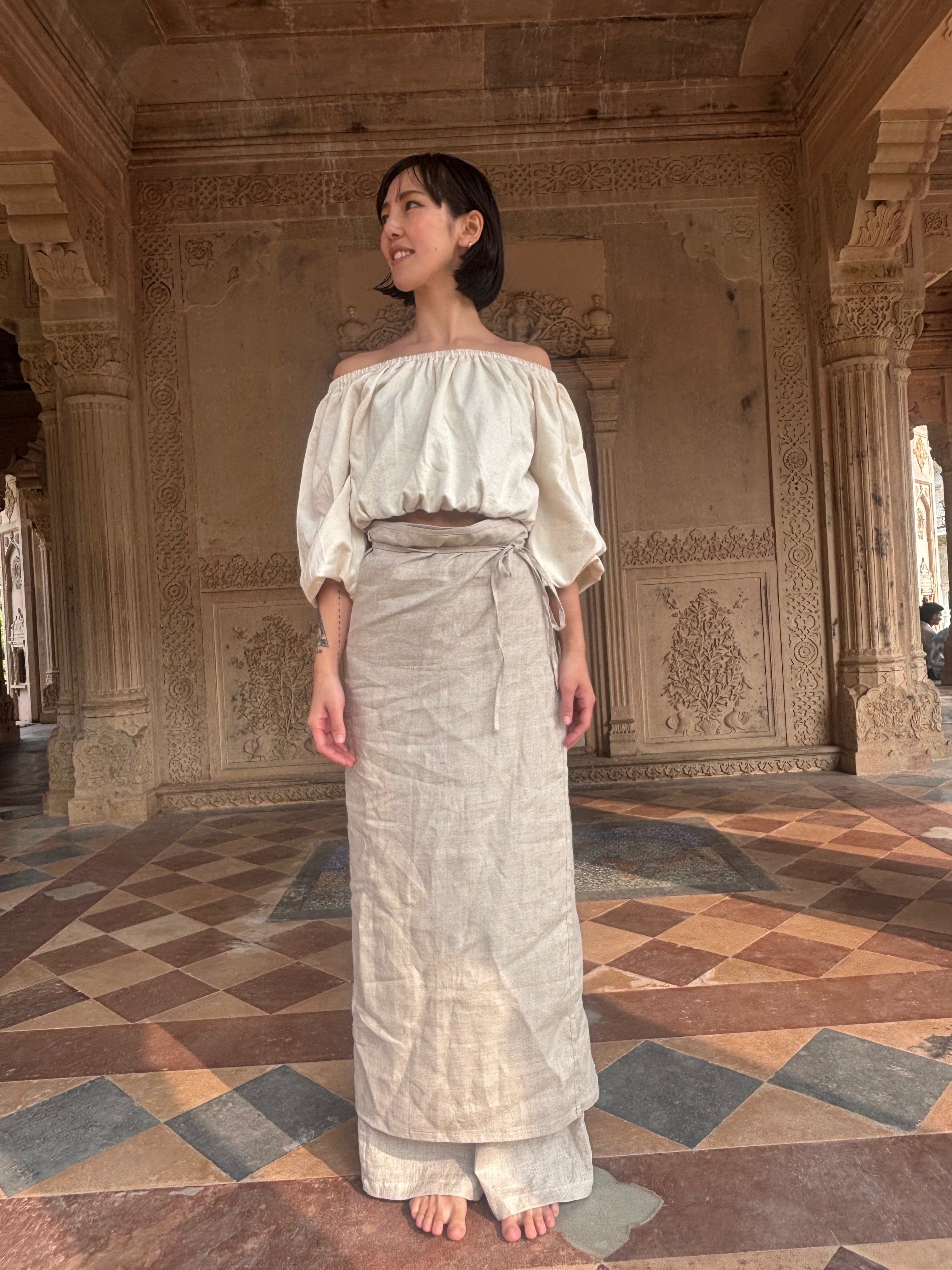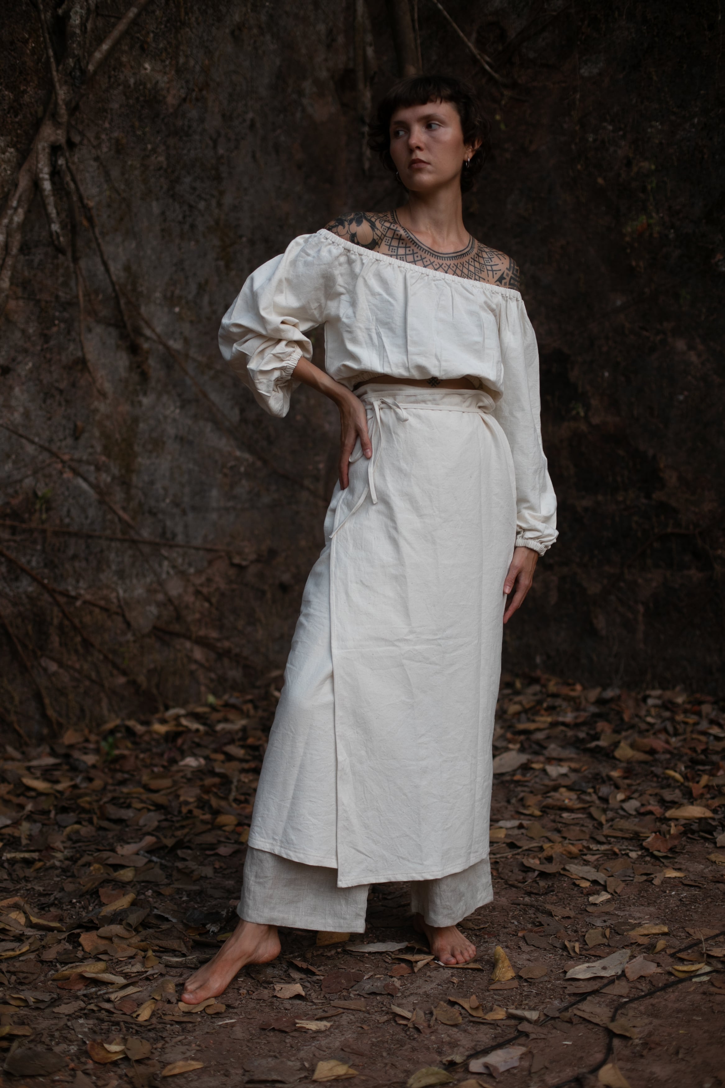 「ハンドルームコットン」で仕立てた、生成りのオフショルダートップスです。