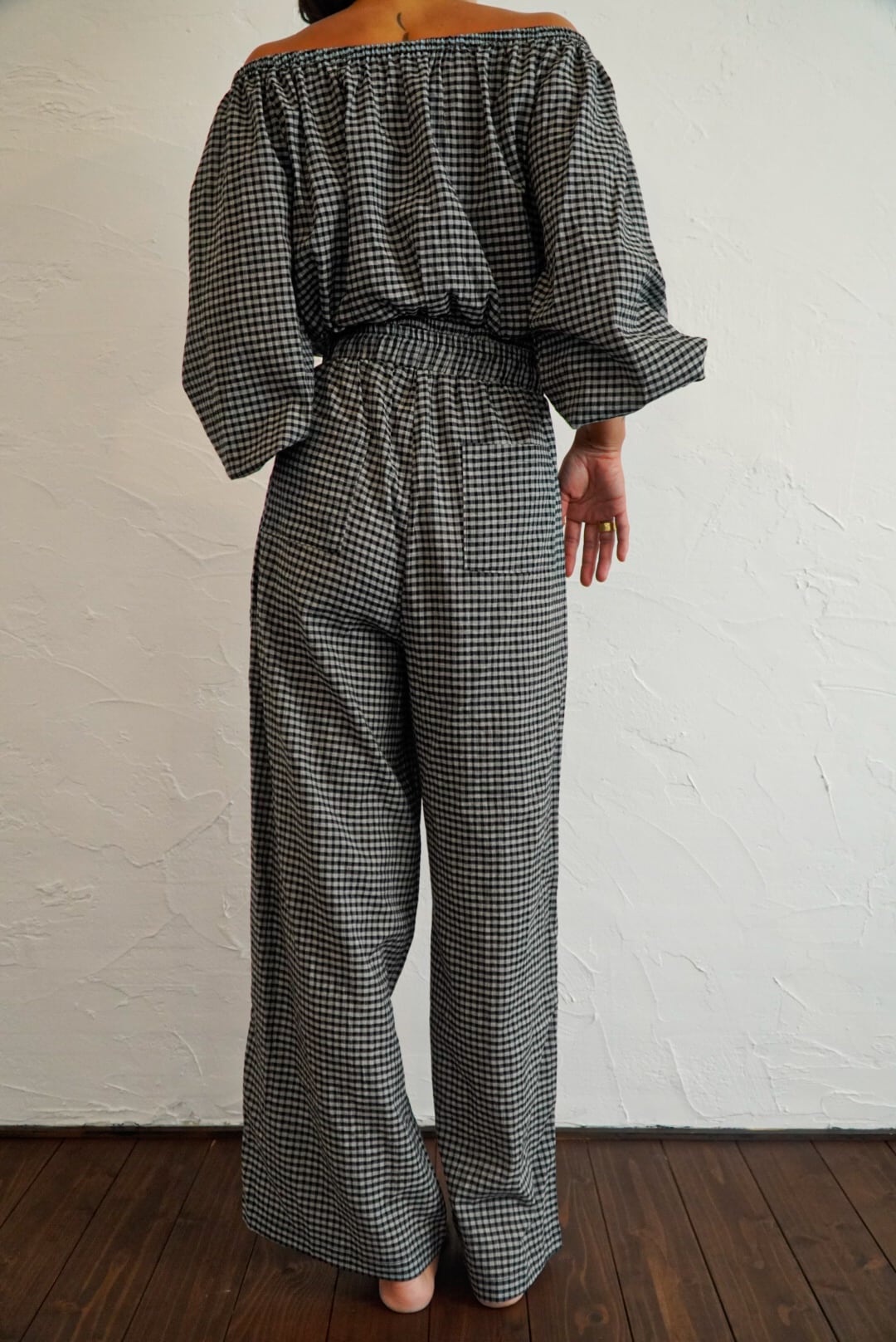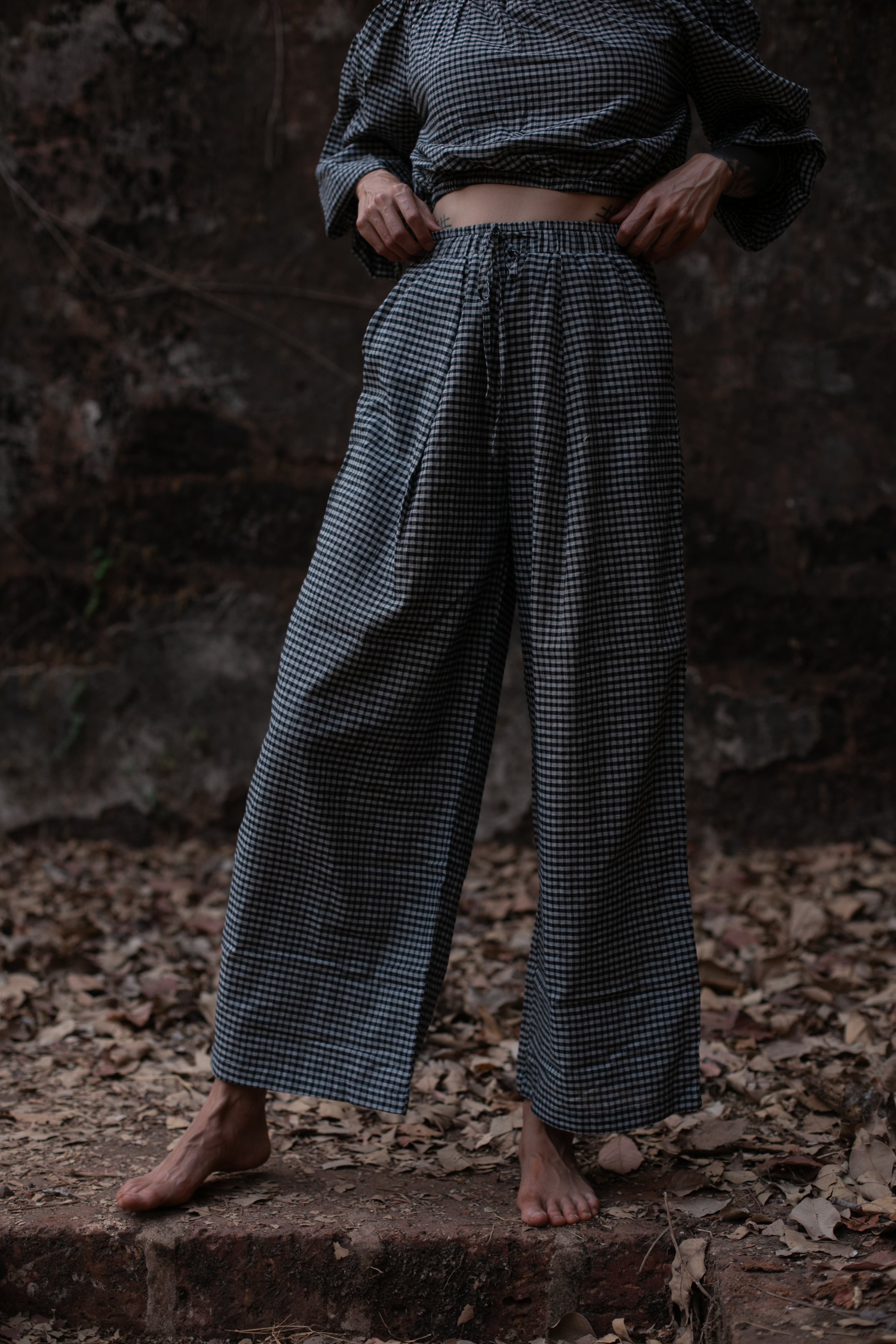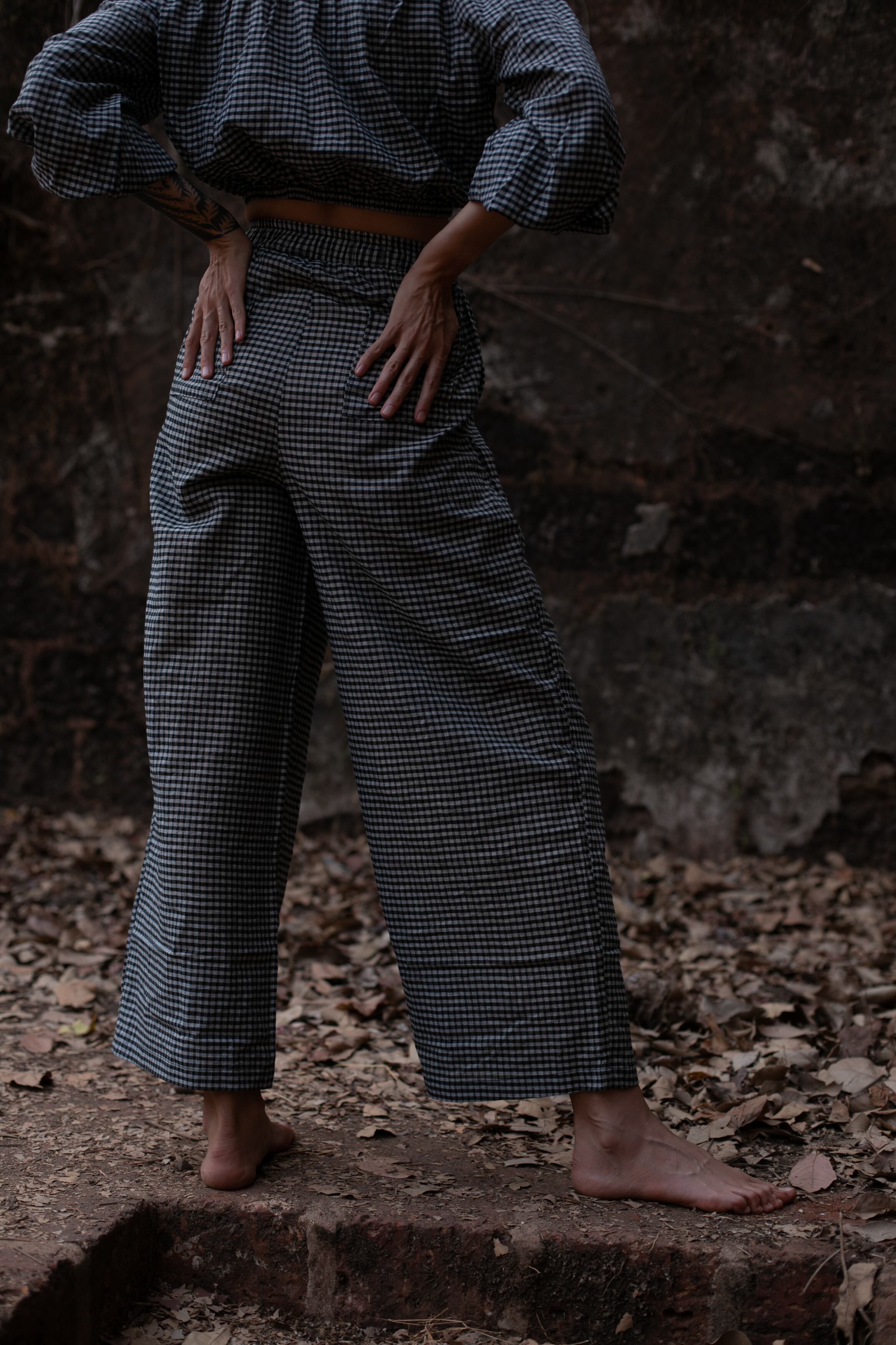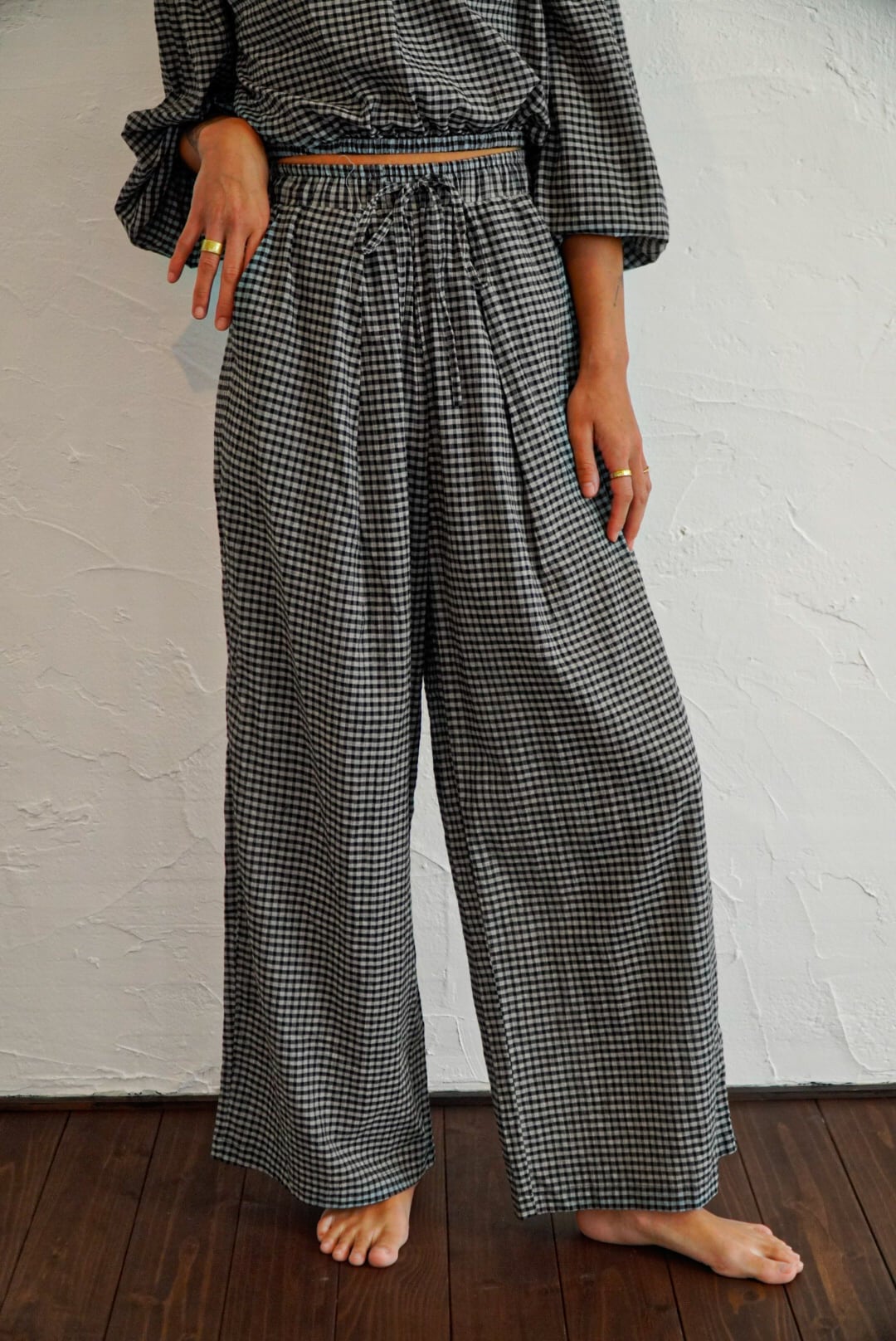インドの伝統的な手織り技術によって織られたチェック生地で仕立てたワイドパンツです。
