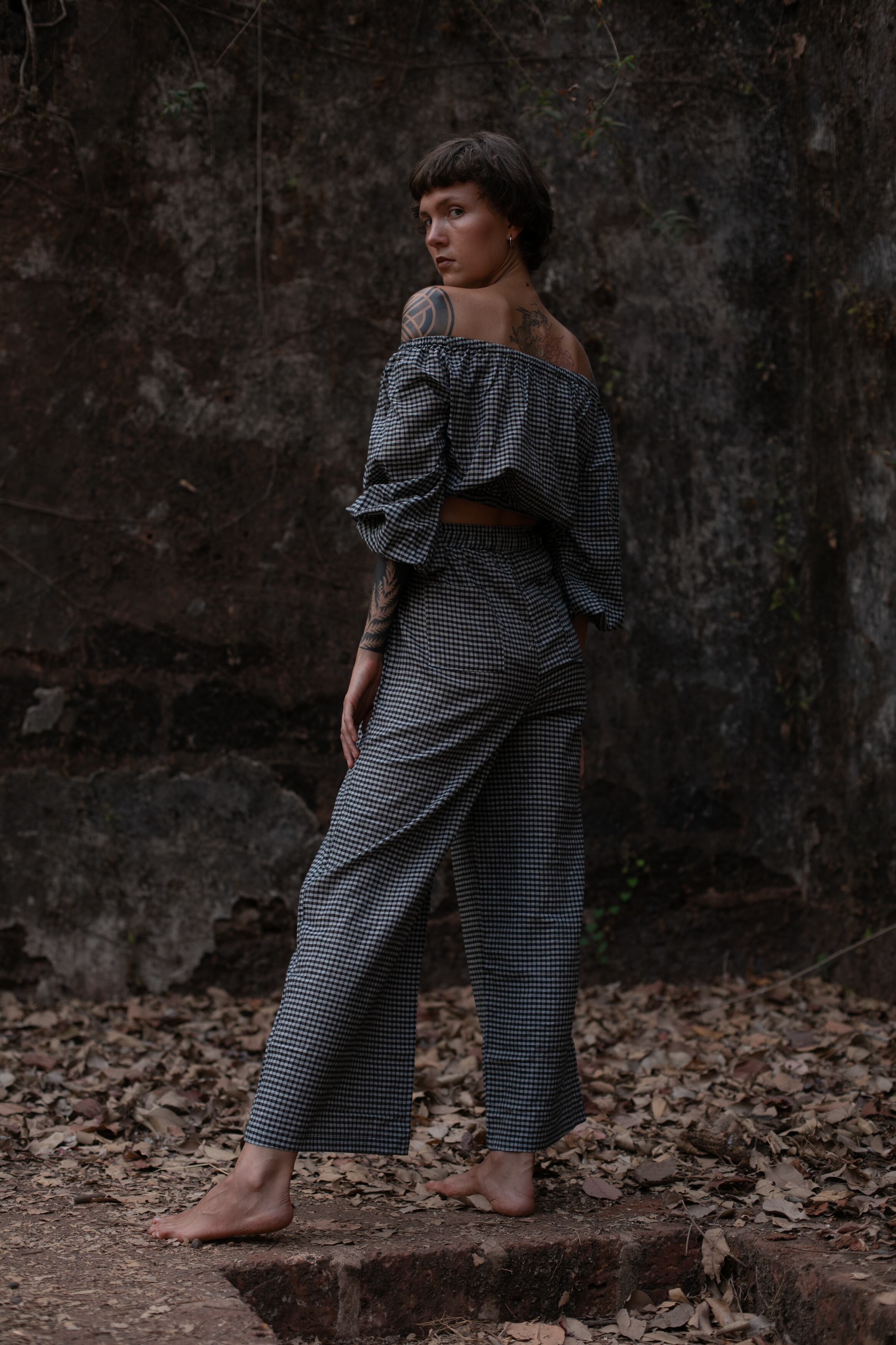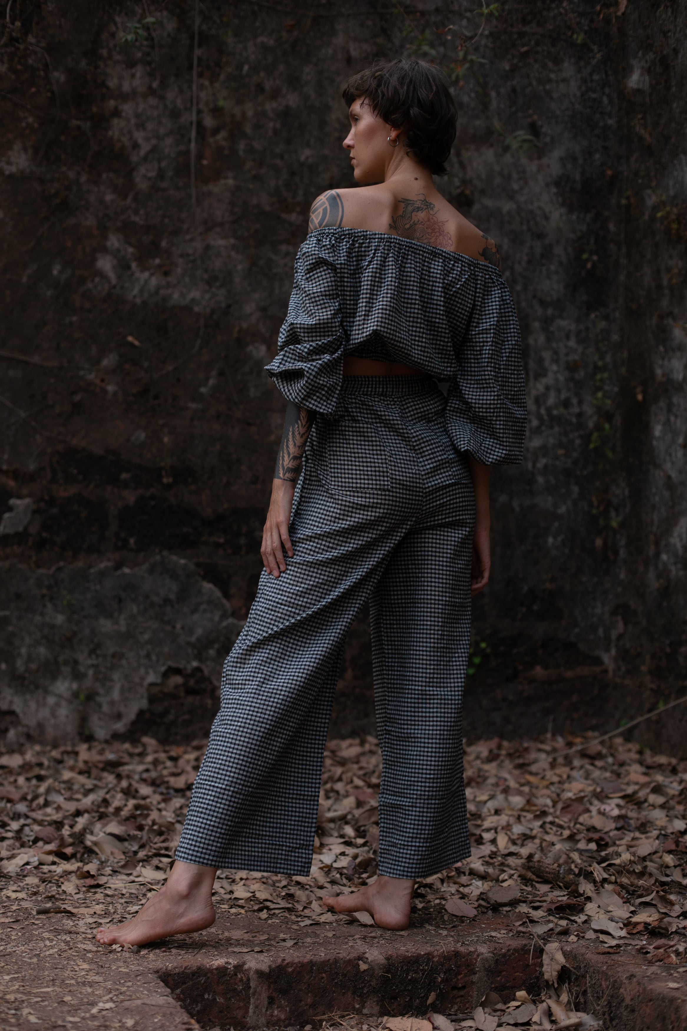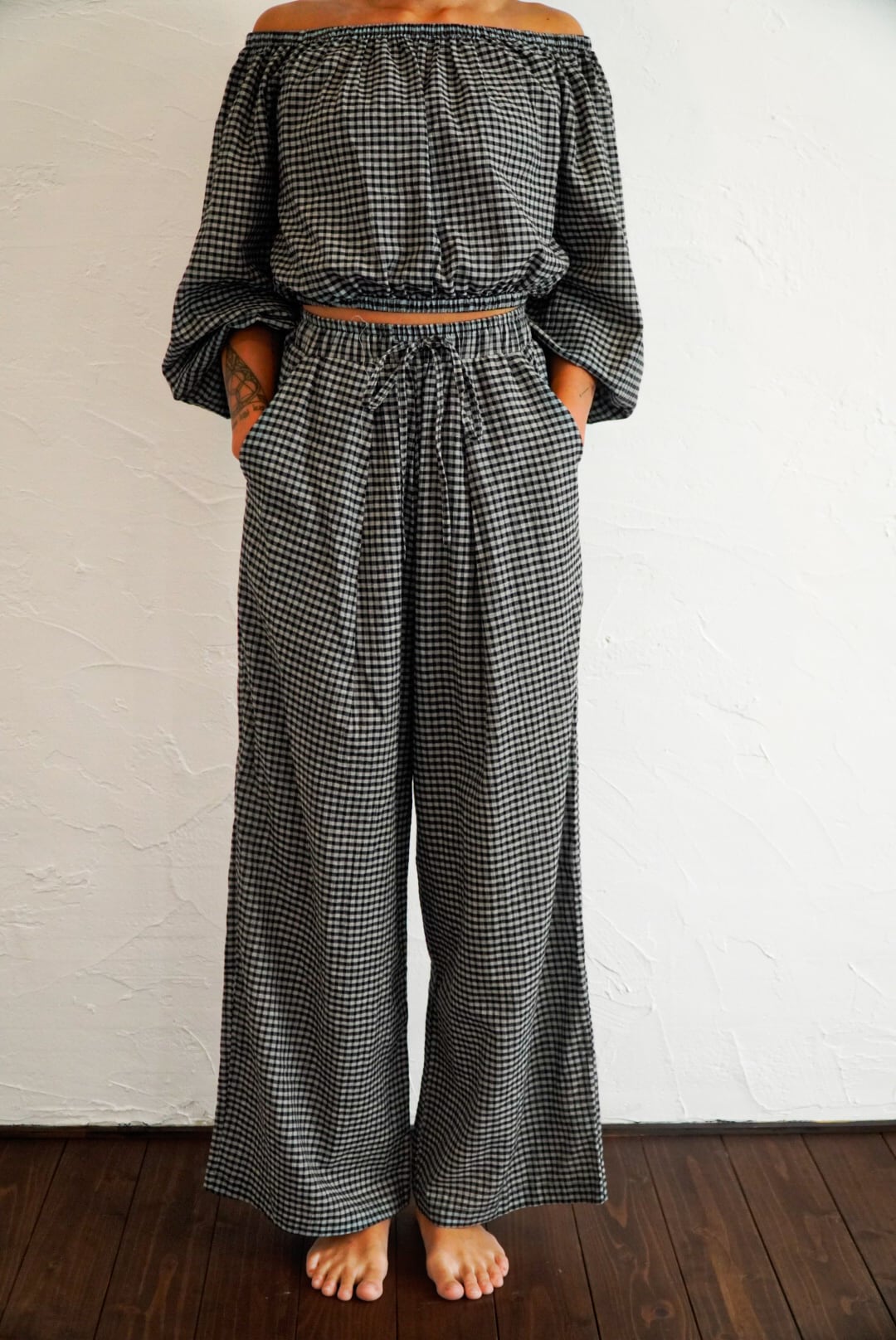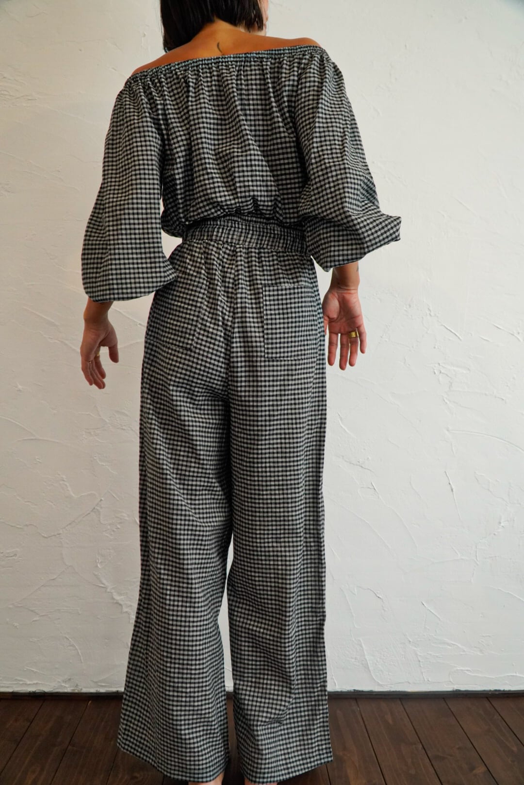 インドの伝統的な手織り技術によって織られたチェック生地で仕立てたワイドパンツです。