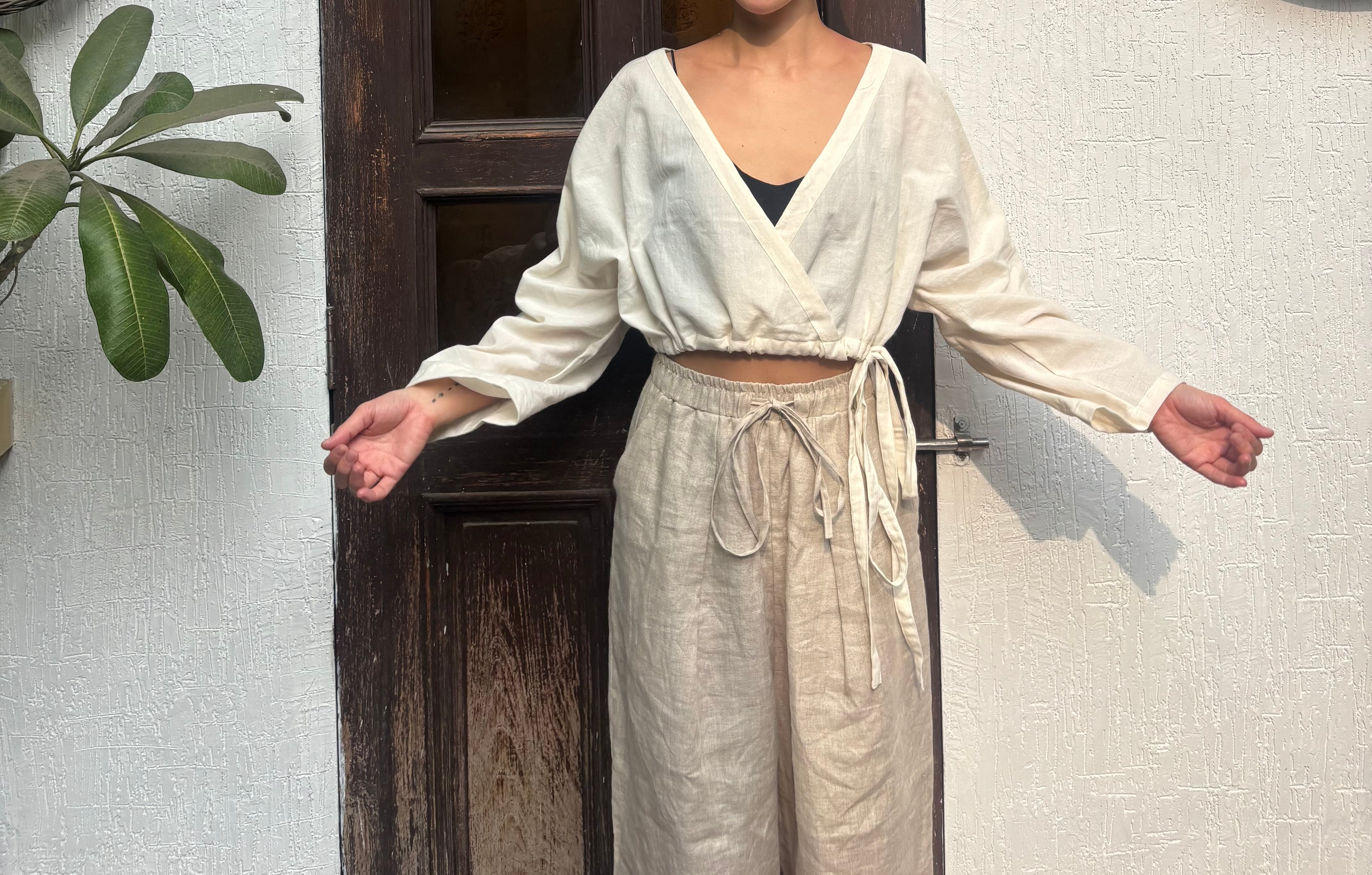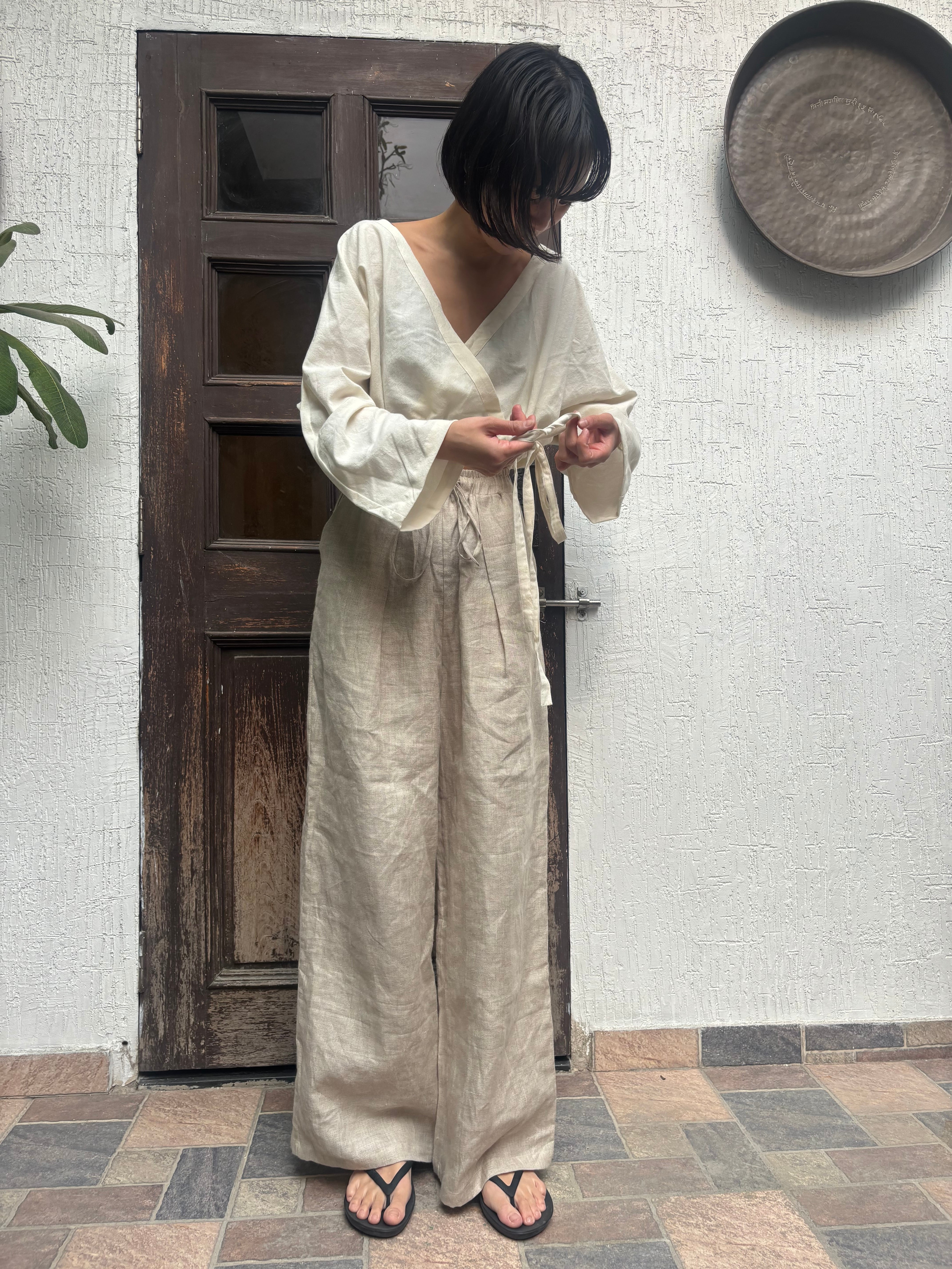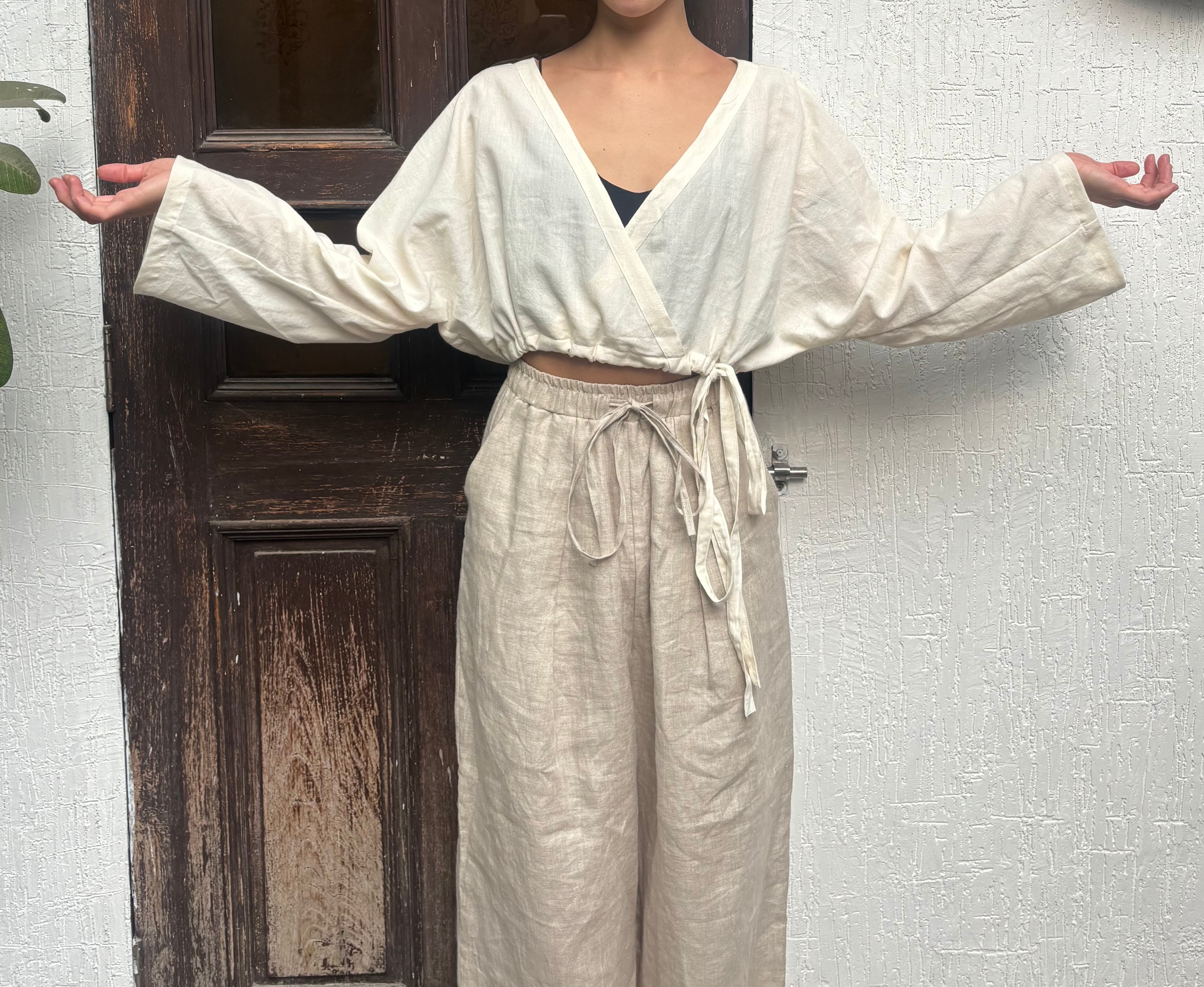 裾の長い紐を絞ることでシルエットが整い、動くたびに布が揺れ、軽やかな立体感が生まれます。