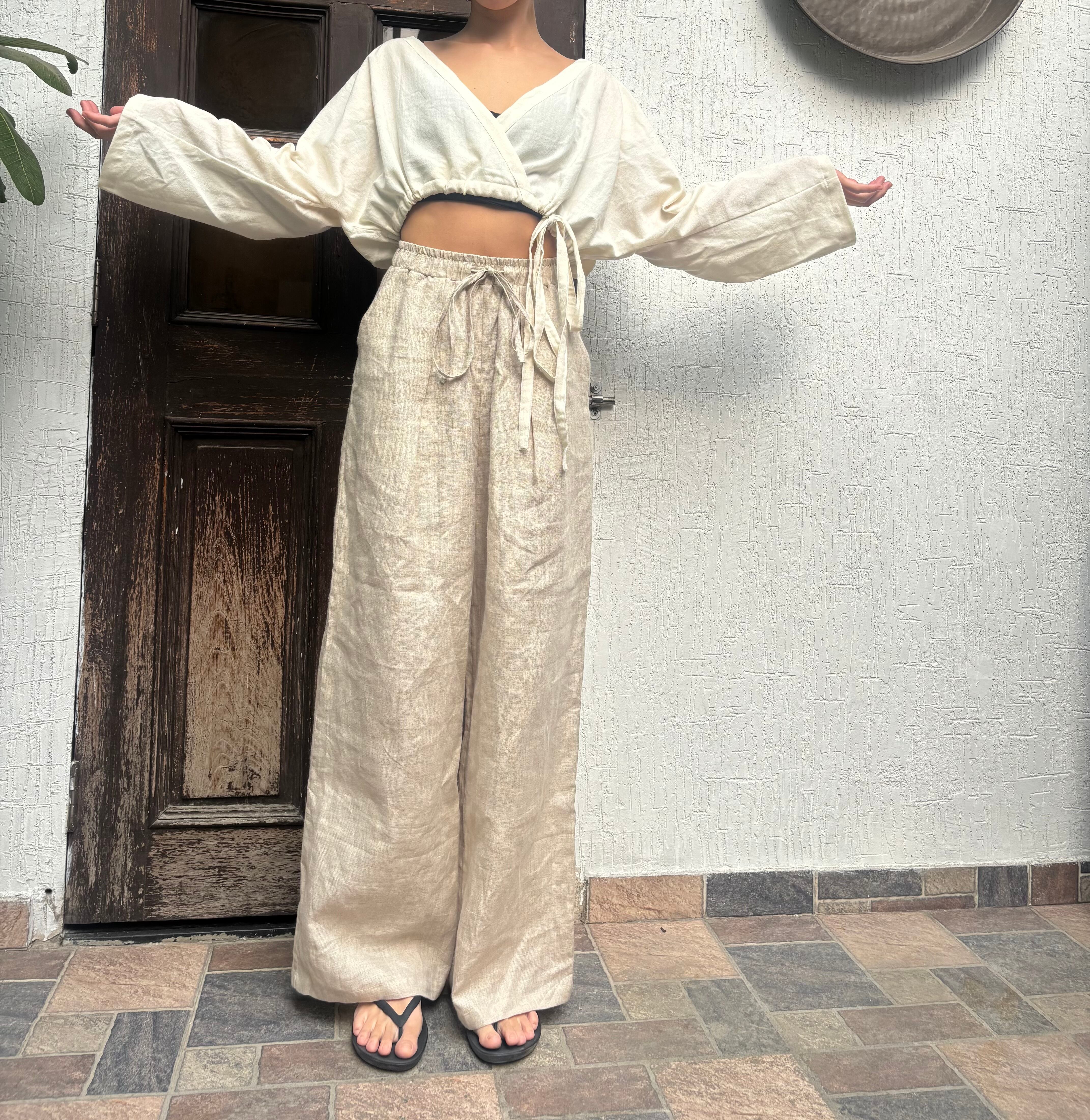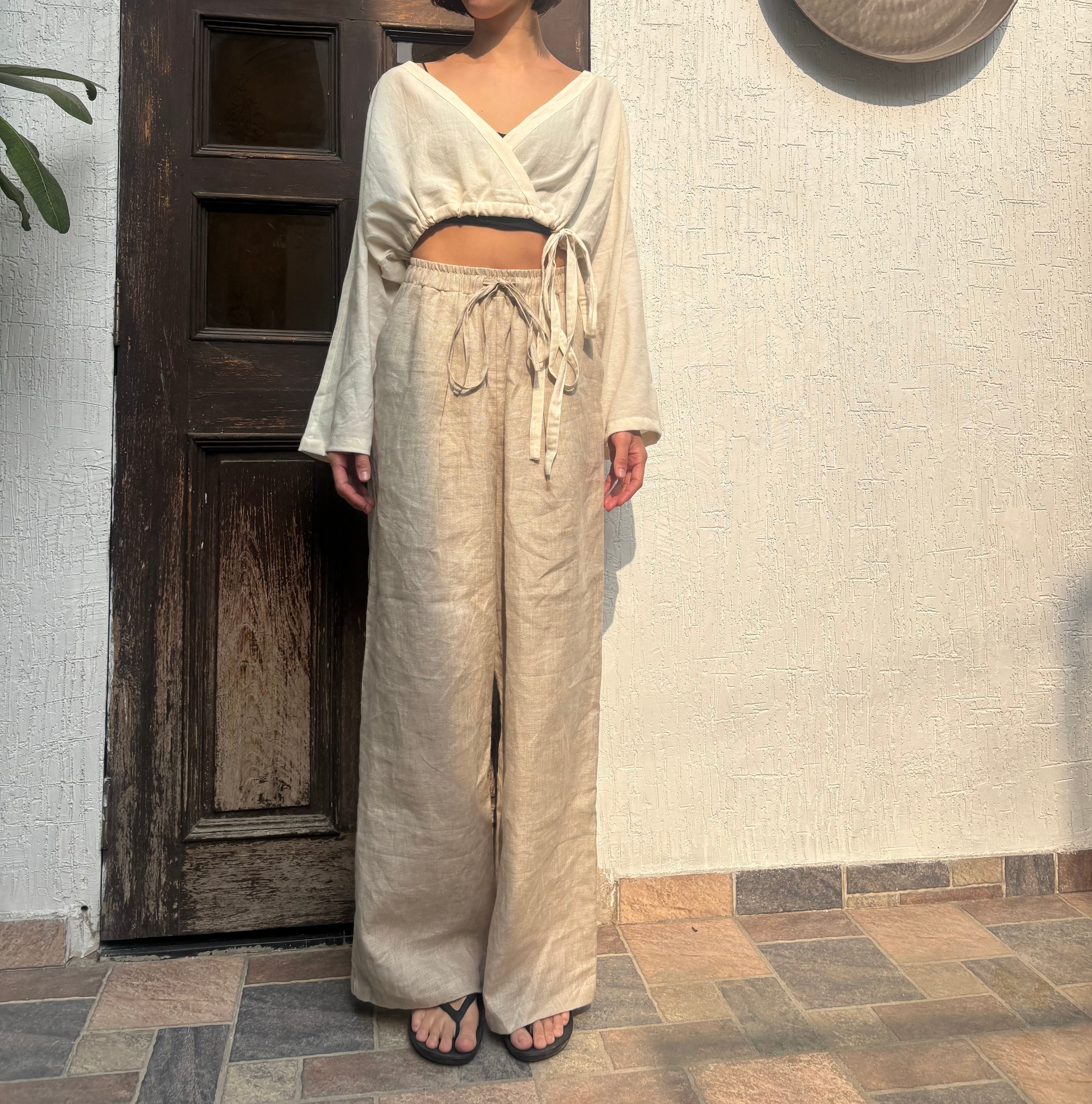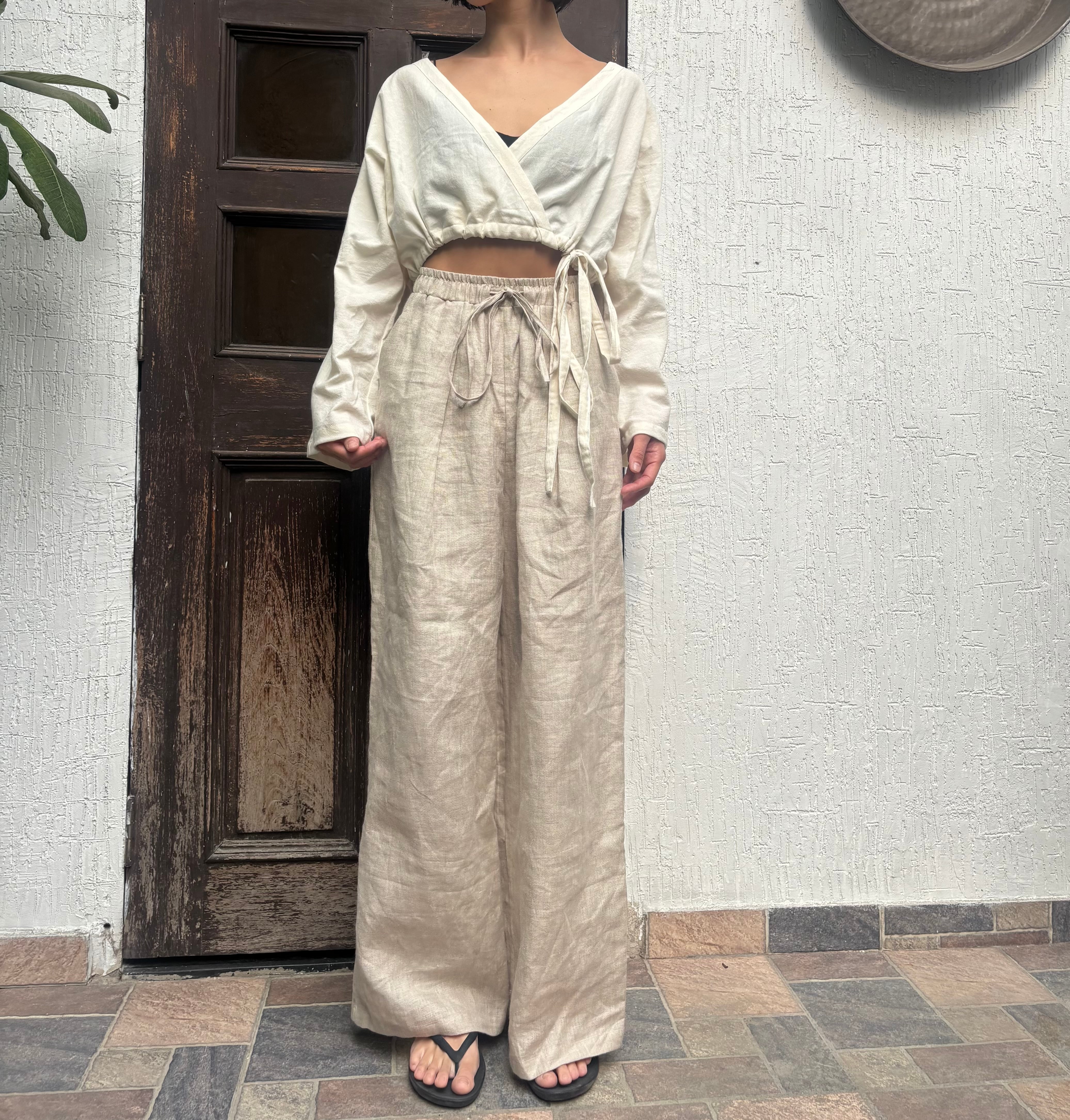 裾の長い紐を絞ることでシルエットが整い、動くたびに布が揺れ、軽やかな立体感が生まれます。