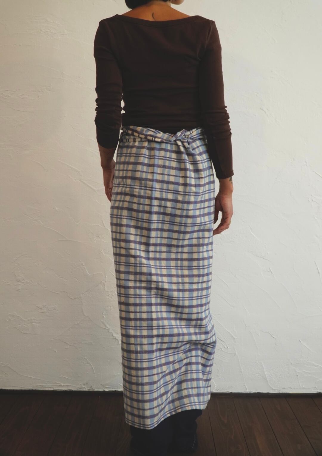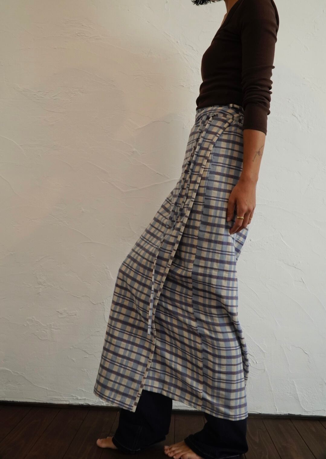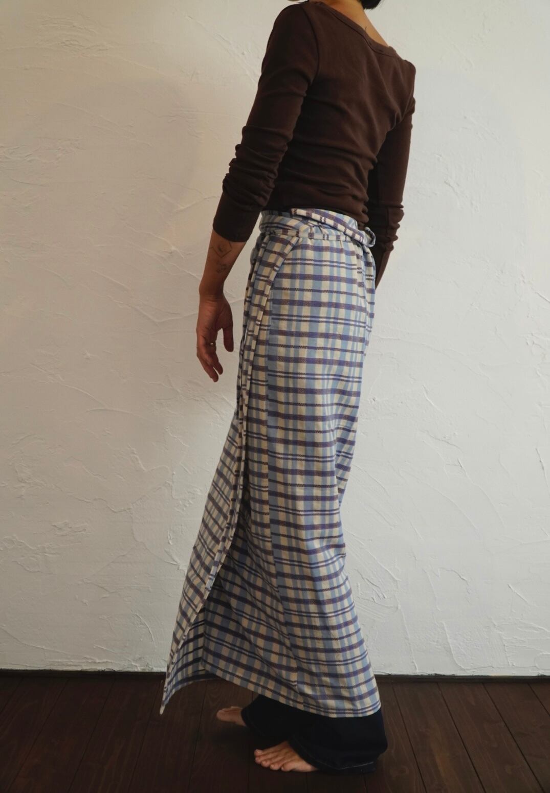 パンツの上から重ねて巻いても、1枚でスカートとして巻いても。季節をまたいで楽しめます。
