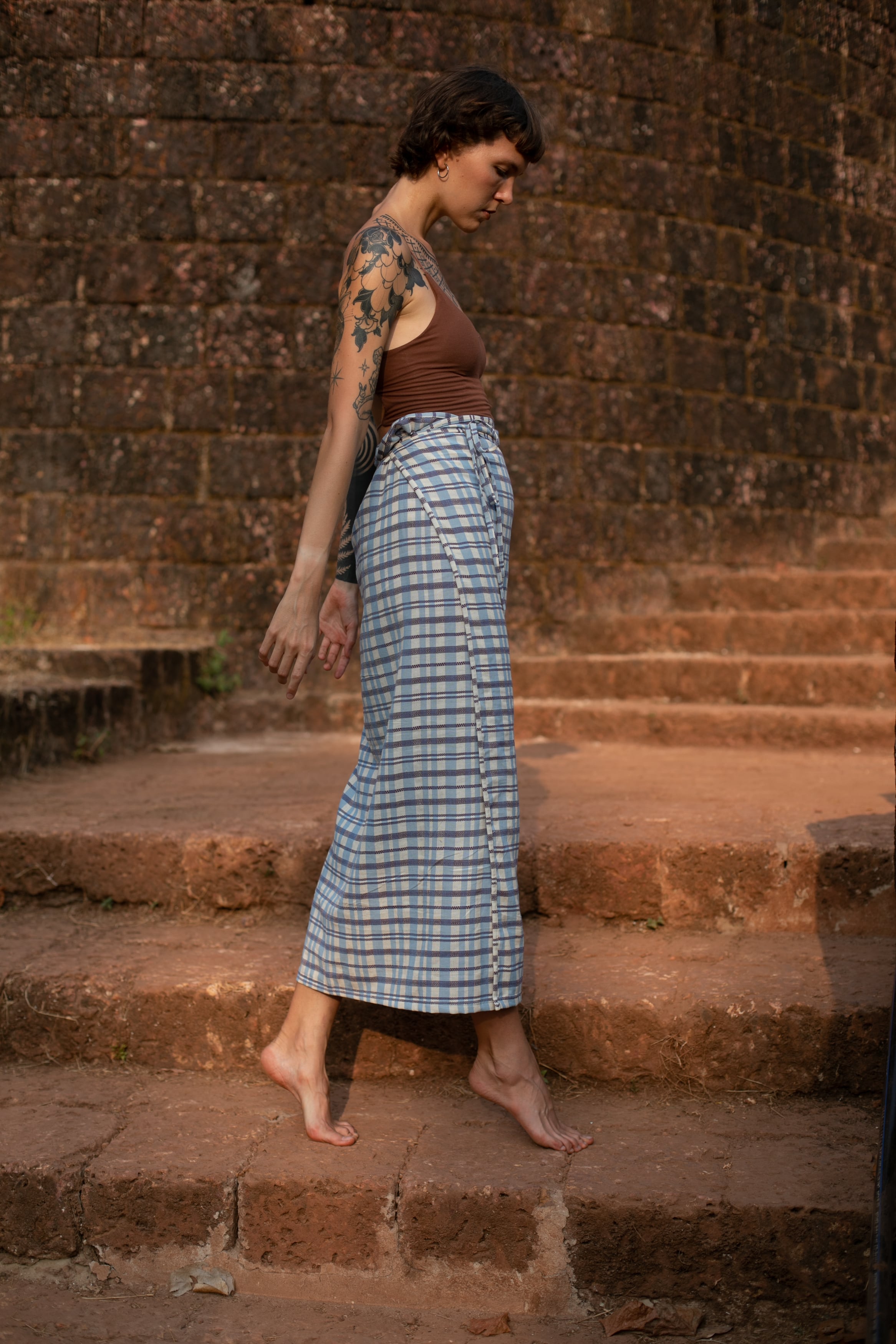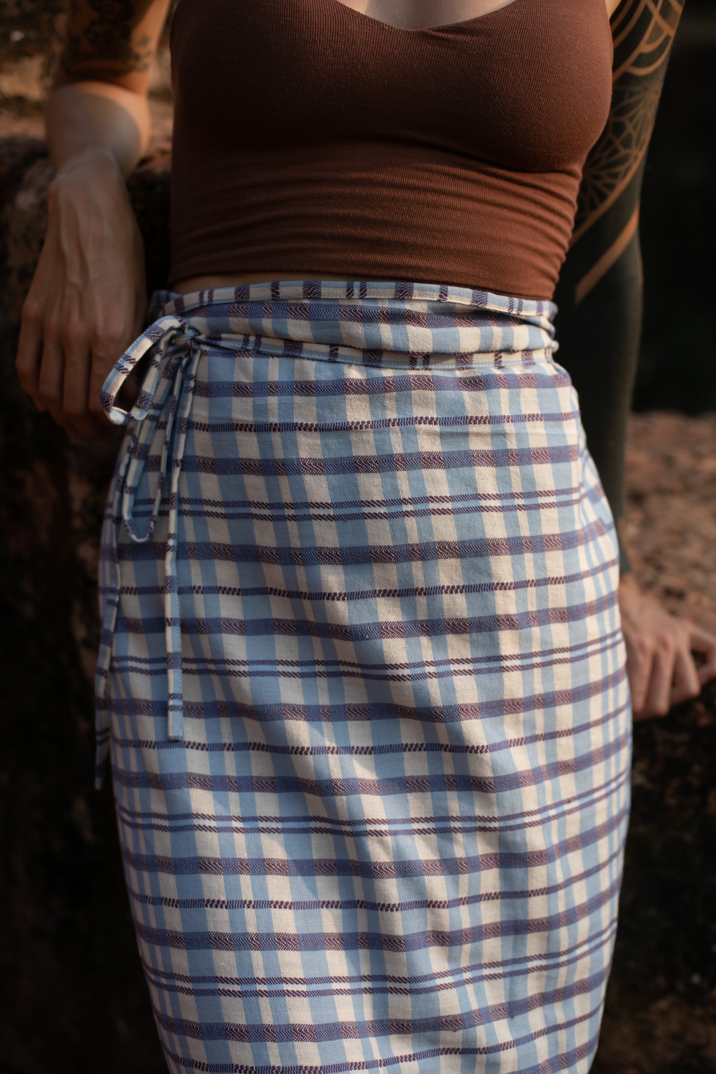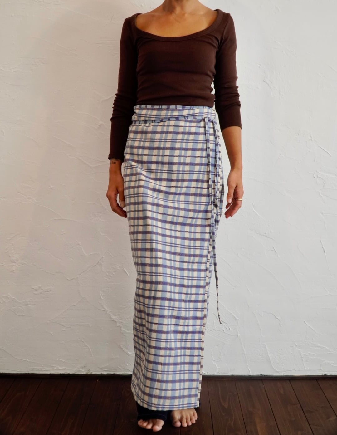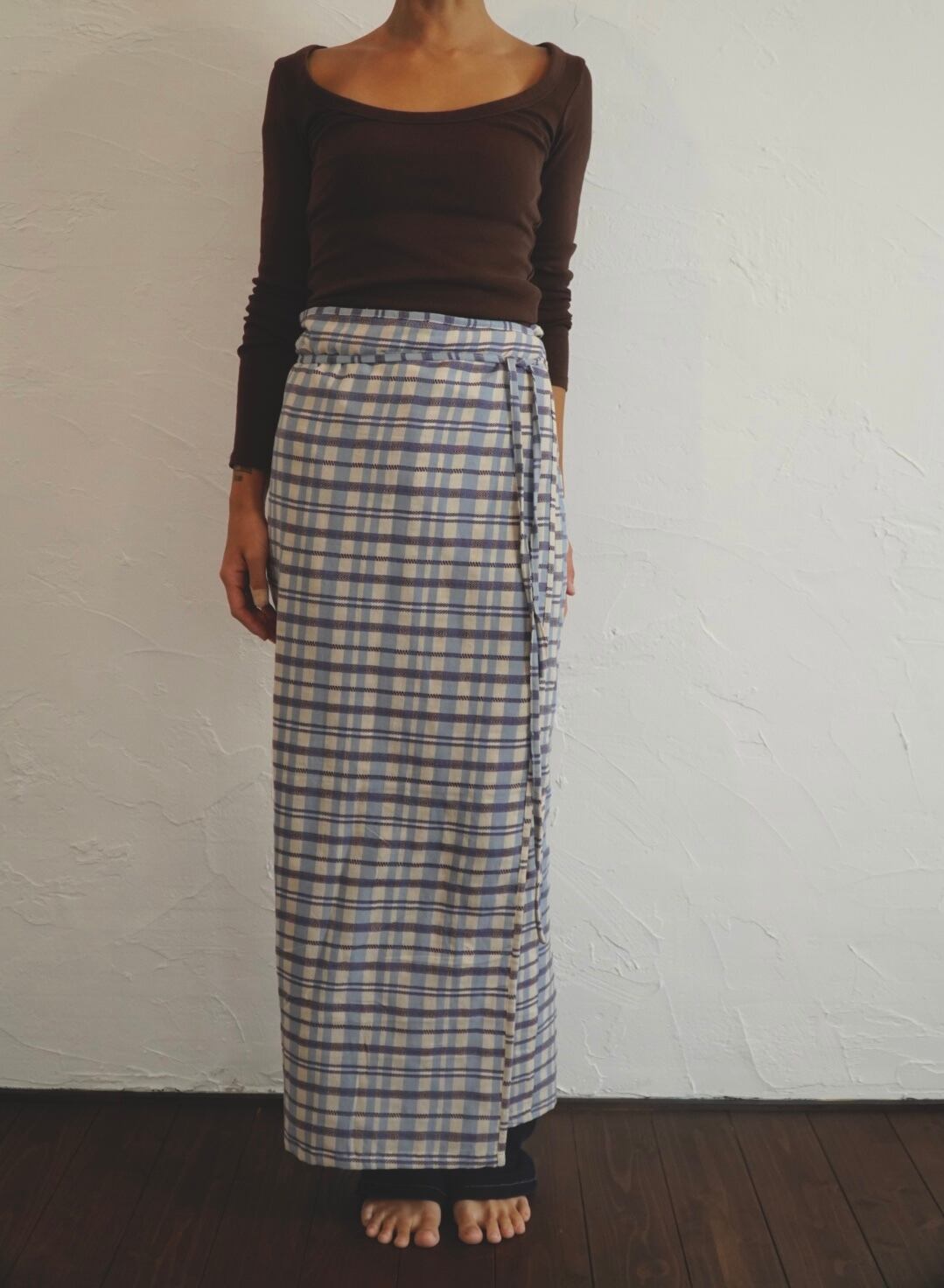 パンツの上から重ねて巻いても、1枚でスカートとして巻いても。季節をまたいで楽しめます。