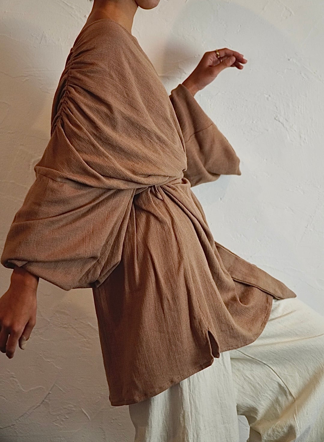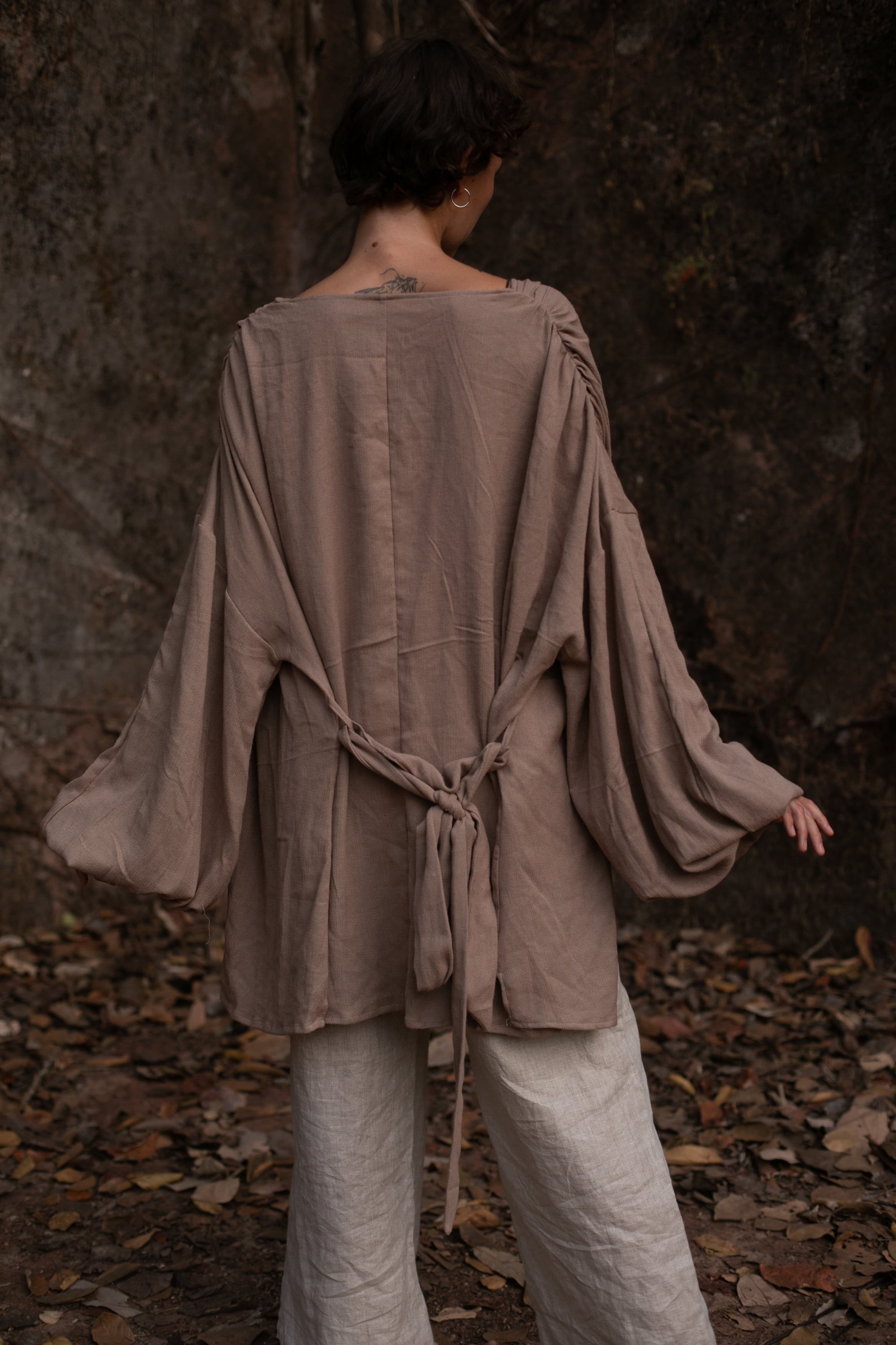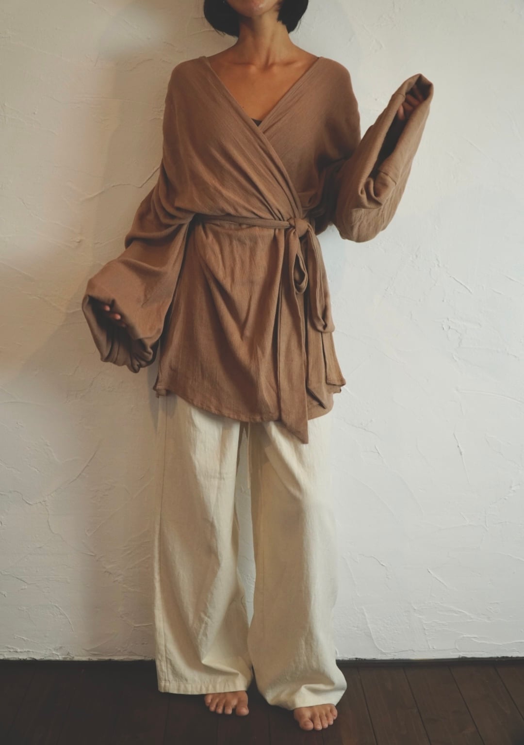 インドのジュート(黄麻)生地を使用し、ボリュームのある袖をあしらった