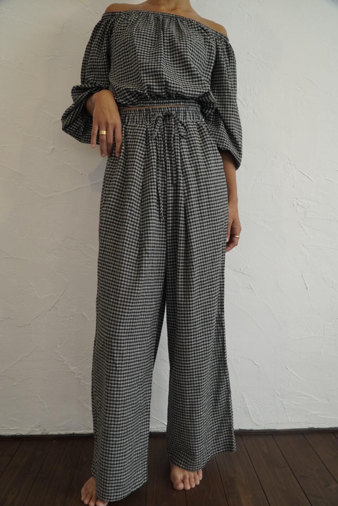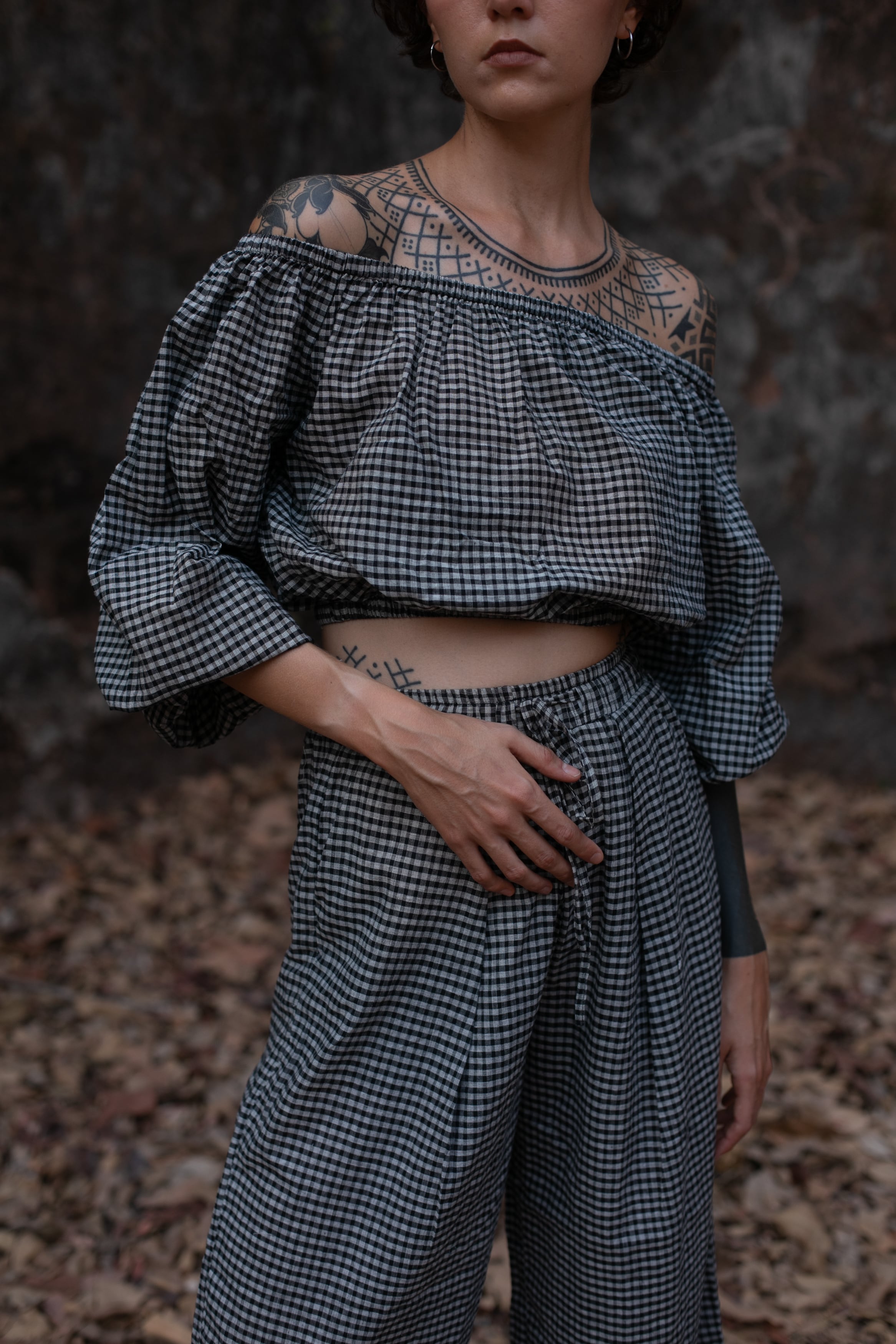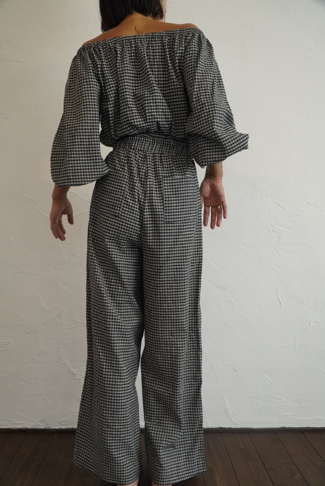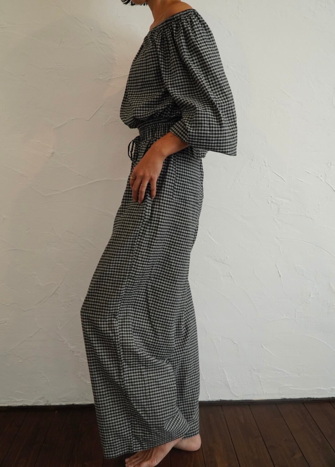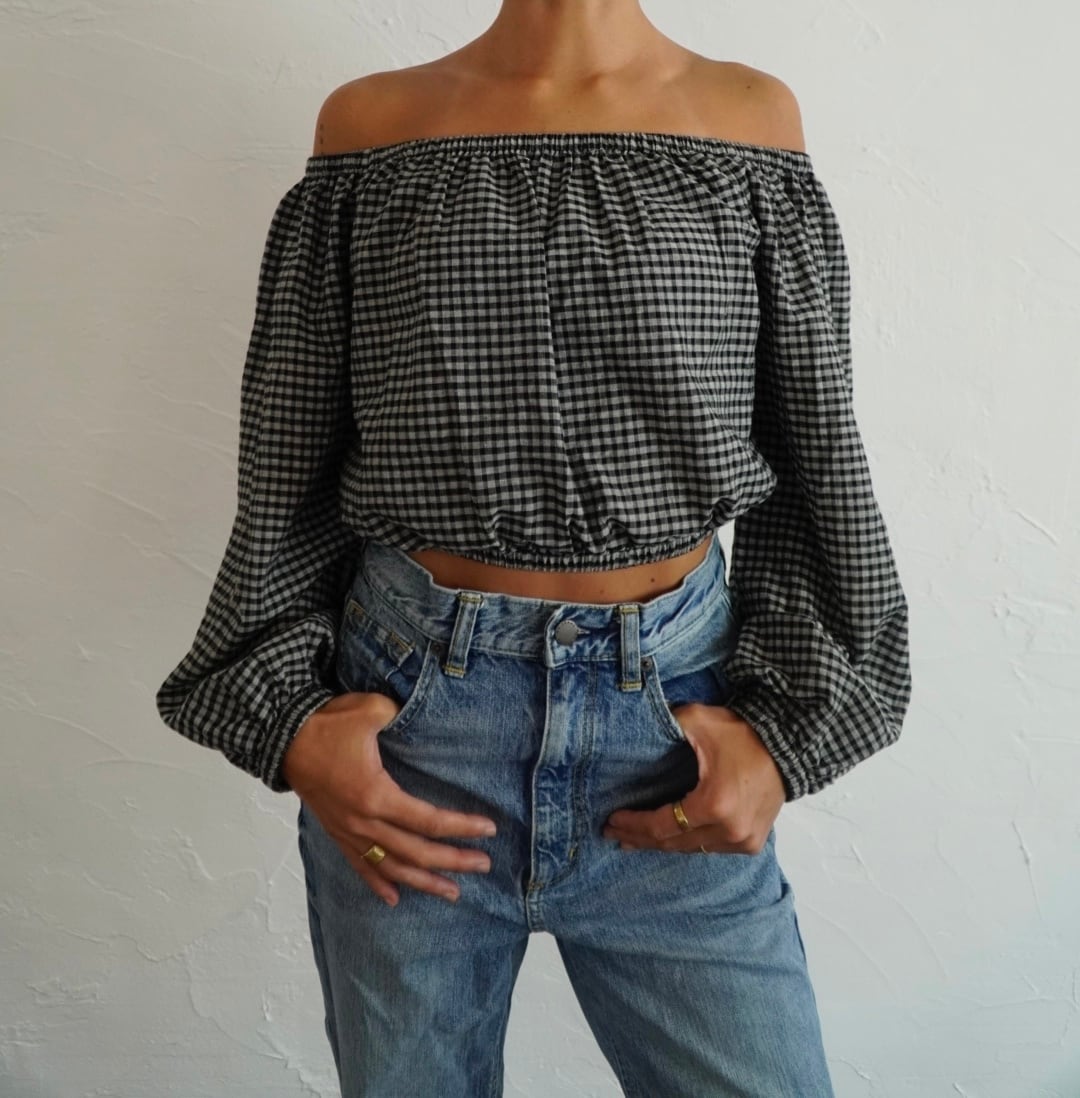 インドの伝統的な手織り技術によって織られたチェック生地で仕立てたオフショルダートップスです。