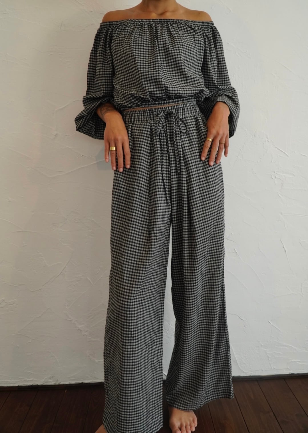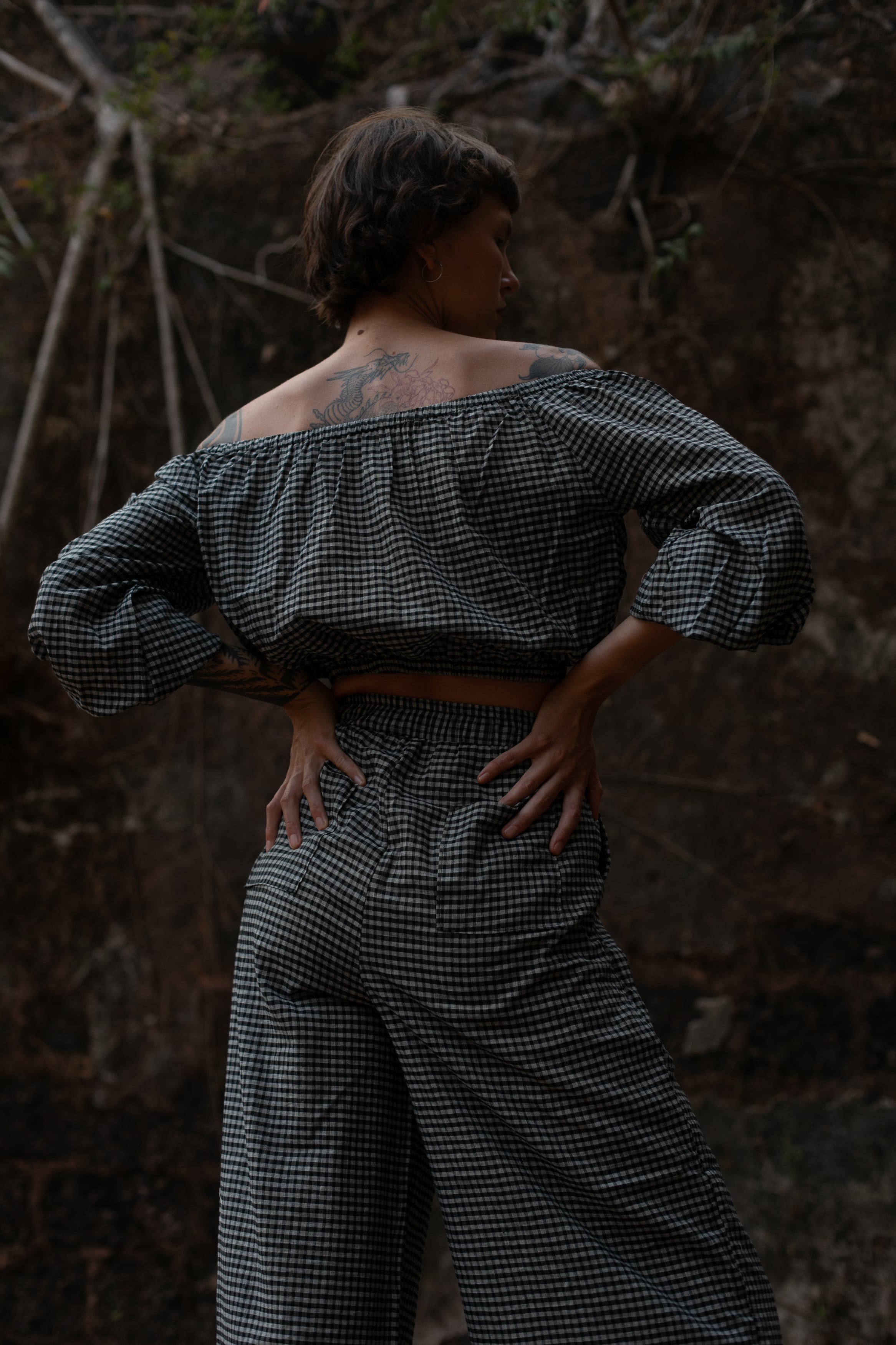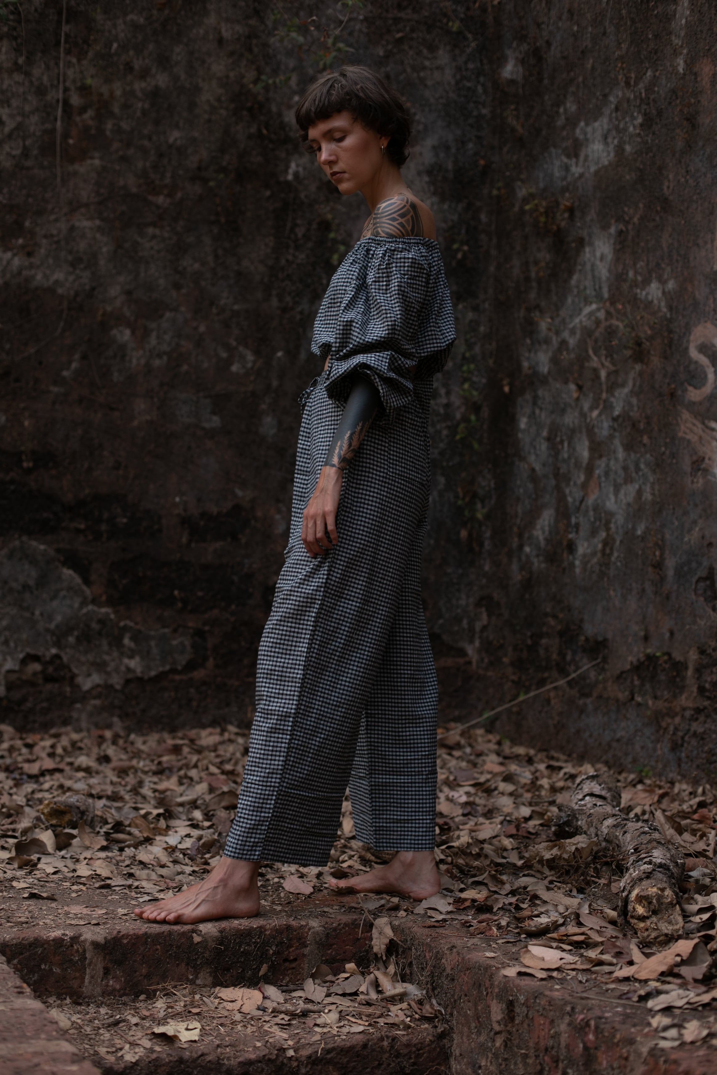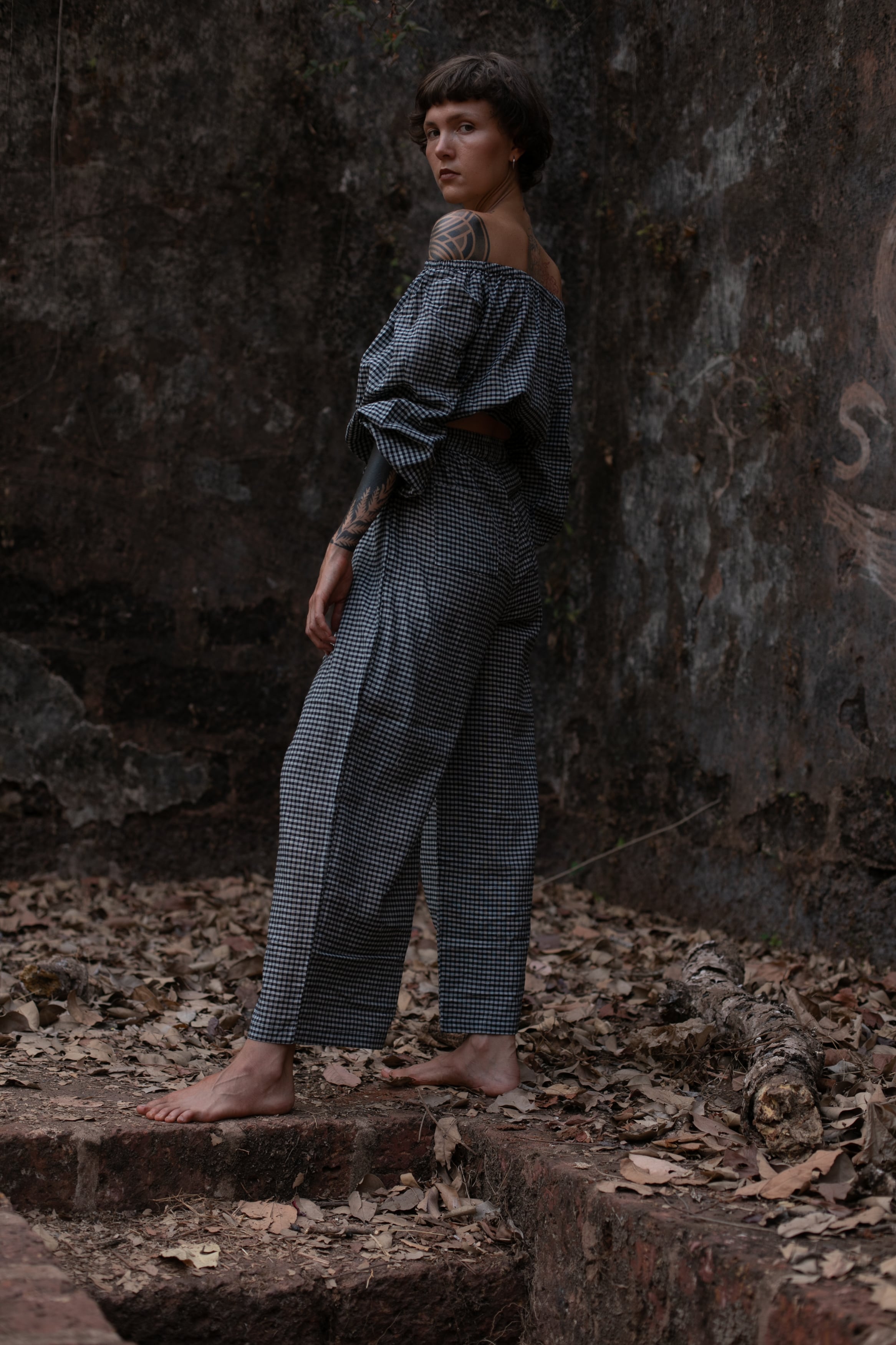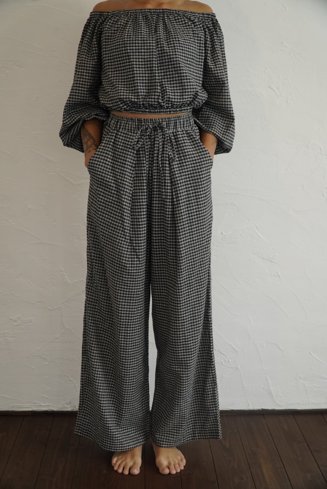 インドの伝統的な手織り技術によって織られたチェック生地で仕立てたオフショルダートップスです。