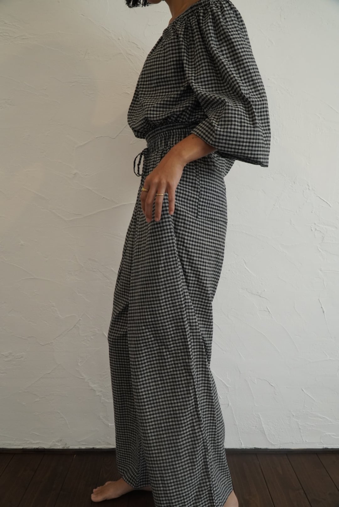 同じ生地のパンツと合わせると、軽やかなセットアップ感も楽しめます。